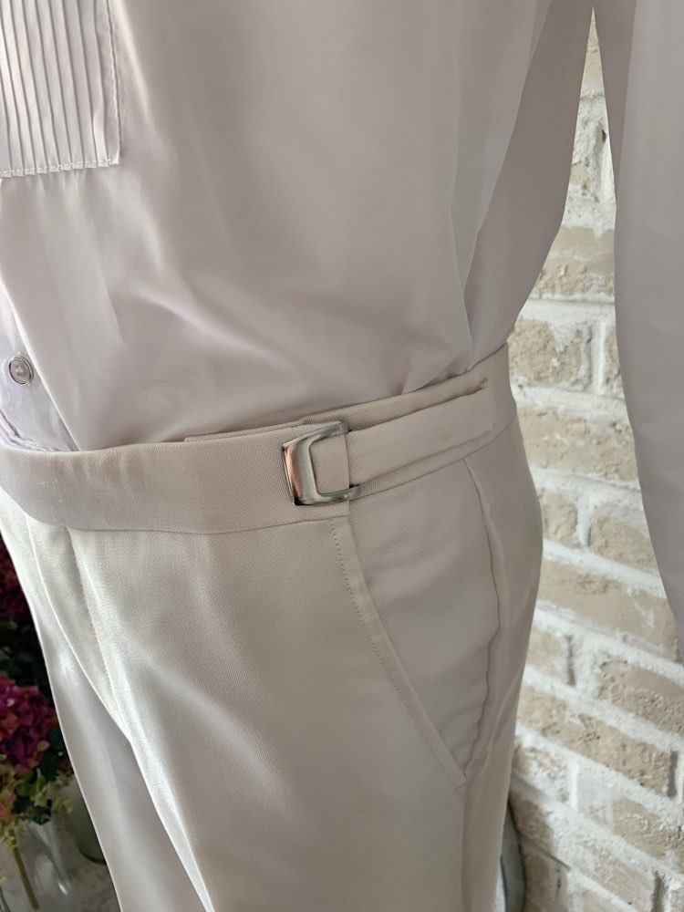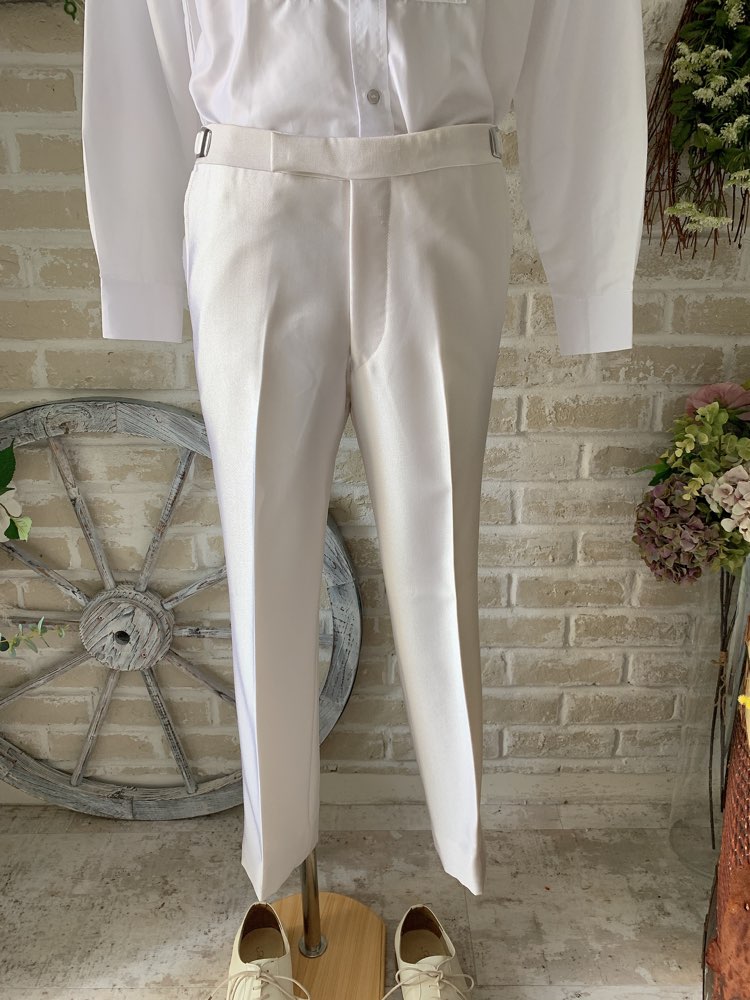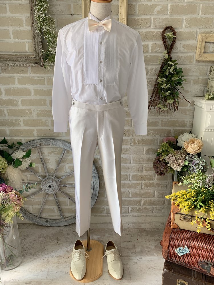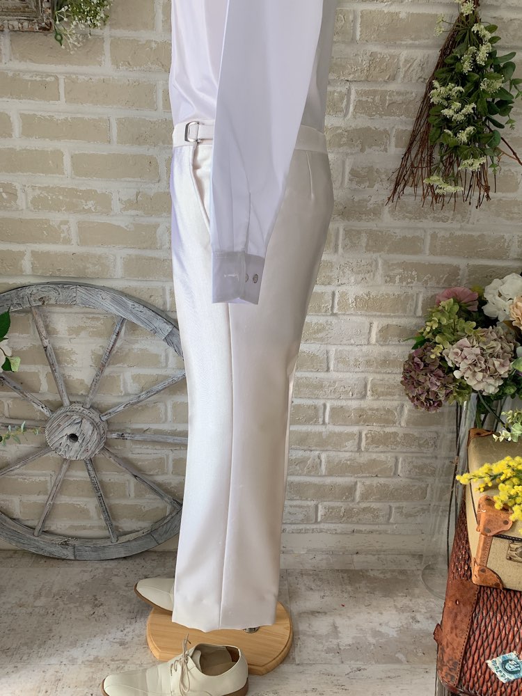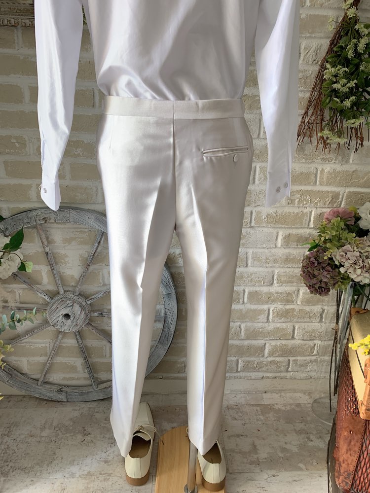 光沢のあるホワイト。アイボリー(白)のモーニングコート。センタープリーツ入りパンツはふと過ぎないストレートなシルエットです。下襟の先がとがったピークドラぺルタイプです。モーニングコートは昼間の時間帯で最も格式の高い正礼装です。シングルブレストという生地を重ねないい形でボタンは一つ。きちんと感を大切にされたい新郎様や非日常を味わいたい方にオススメのスタイルです。ジャケット、ベスト、パンツの3ピースタイプ。少しおしゃれなカジュアルに着崩すならベストはチェックやストライプ柄や、ワインレッド、ゴールド、シルバー、グレー、スモーキーピンク、ブラック、ブルーなどのベストを差し色として合わせるのもオススメです。合わせるシャツをチェック、ドット、ストライプ、花柄、ネイビー、ブラック、グレーシャツで合わせてカジュアルな二次会タキシードとしても素敵。また白のウィングカラーシャツを合わせればきちんとした結婚式や披露宴向けのフォーマルなコーディネートになります。披露宴・結婚式・パーティースーツ・二次会・海外ウェディング・フォトウェディング、前撮りにまで幅広いシーンでご使用いただけます。オールシーズンに適してます