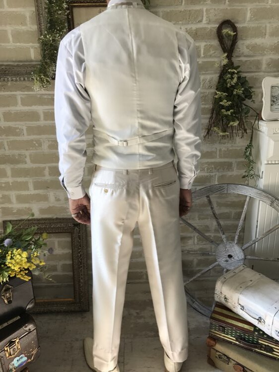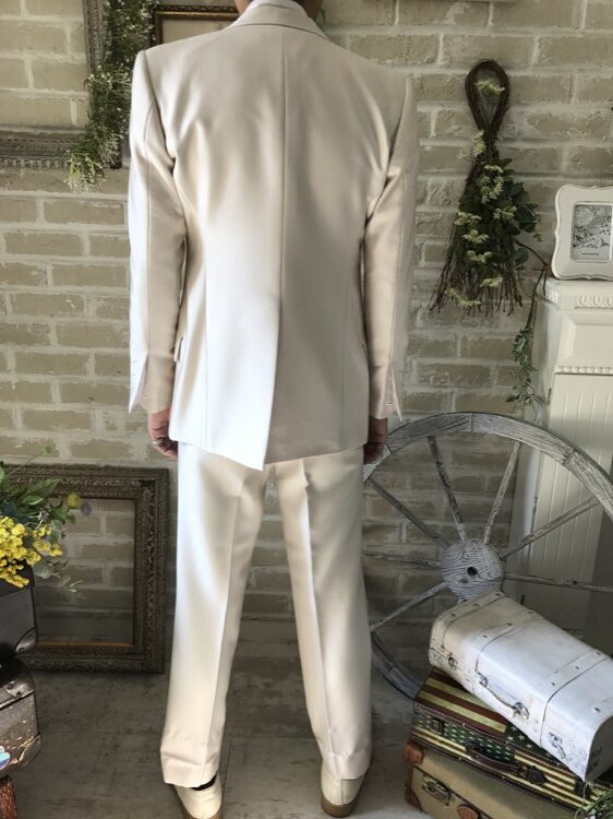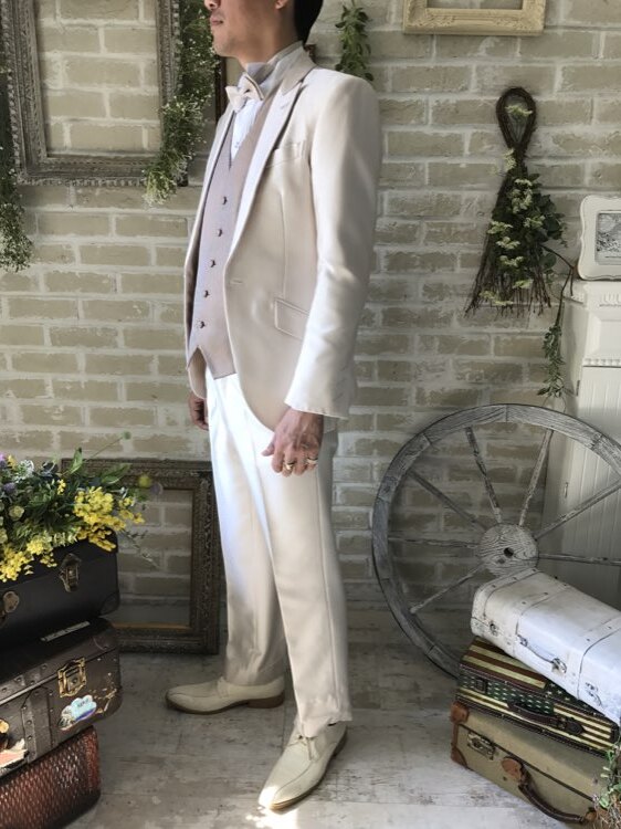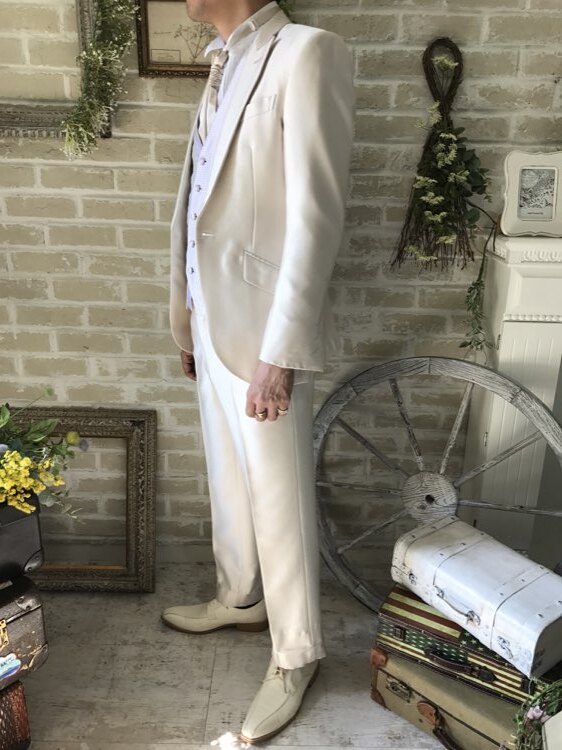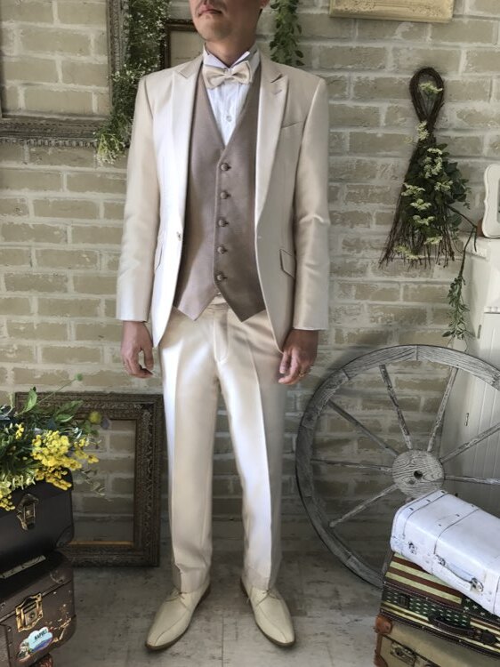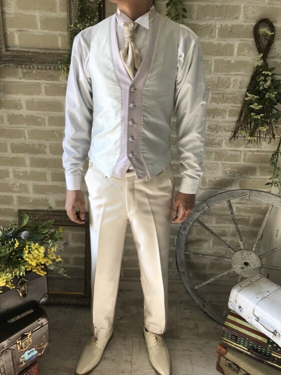 身ごろの左下にうっすらとしたシミあり。ピンクベージュ・シャンパン・ベージュ・グレージュの光沢のあるモーニングコート。センタープリーツ入りパンツはふと過ぎないストレートなシルエットです。下襟の先がとがったピークドラぺルタイプです。モーニングコートは昼間の時間帯で最も格式の高い正礼装です。シングルブレストという生地を重ねないい形でボタンは一つ。きちんと感を大切にされたい新郎様や非日常を味わいたい方にオススメのスタイルです。ジャケット、ベスト、パンツの3ピースタイプ。少しおしゃれなカジュアルに着崩すならベストはチェックやストライプ柄や、ワインレッド、ゴールド、シルバー、グレー、スモーキーピンク、ブラック、ブルーなどのベストを差し色として合わせるのもオススメです。合わせるシャツをチェック、ドット、ストライプ、花柄、ネイビー、ブラック、グレーシャツで合わせてカジュアルな二次会タキシードとしても素敵。また白のウィングカラーシャツを合わせればきちんとした結婚式や披露宴向けのフォーマルなコーディネートになります。披露宴・結婚式・パーティースーツ・二次会・海外ウェディング・フォトウェディング、前撮りにまで幅広いシーンでご使用いただけます。オールシーズンに適してます。