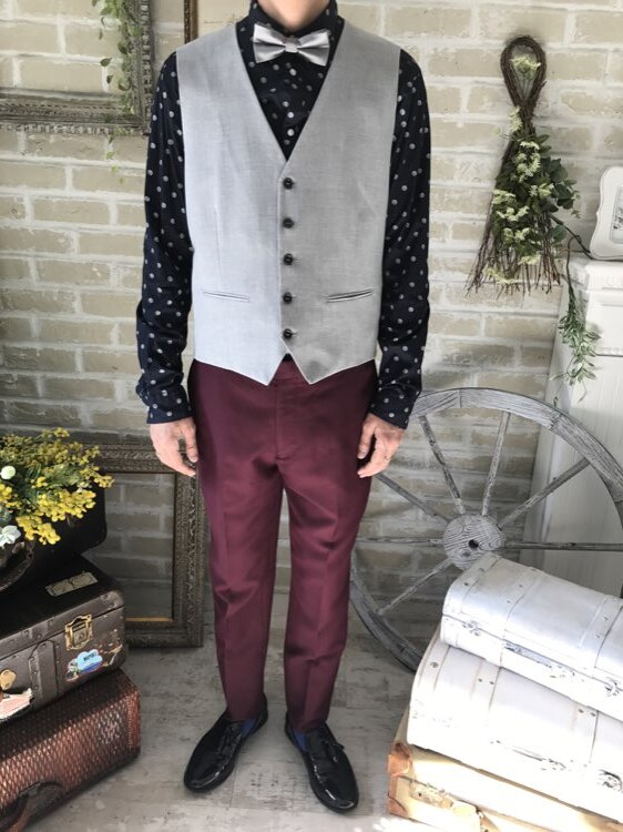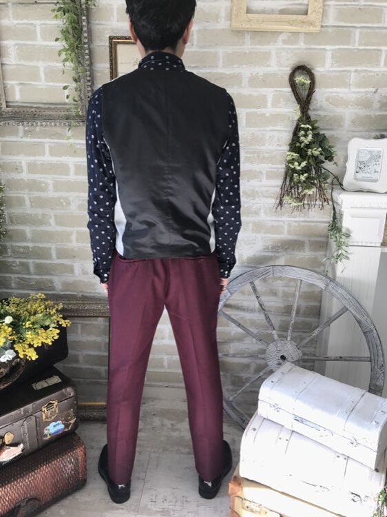 他にない珍しいバーガンディー・ワインレッドのタキシード。黒のサテン地のショール・カラータイプ。ジャケット、パンツの2ピースタイプ。パンツはサイドポケット付き。バックにもポケット付き。センタークリース入り。スリムフィット―太もも、膝、足首に緩やかなラインでフィットし、レッグラインに沿ったシルエットを綺麗に創り出します。ベストはチェック柄や、ブラック、グレー、カラーなどのベストを差し色として合わせるのもオススメです。合わせるシャツをドット、ストライプ、花柄、ネイビー、ブラック、グレーシャツで合わせてカジュアルな二次会タキシードとしても素敵。また白のウィングカラーシャツを合わせればきちんとした結婚式や披露宴向けのフォーマルなコーディネートになります。二次会の披露宴・結婚式・ゲスト結婚式の参列向け。パーティースーツ・二次会・海外ウェディング・フォトウェディング、前撮りにまで幅広いシーンでご使用いただけます。秋冬のシーズンにオススメです。