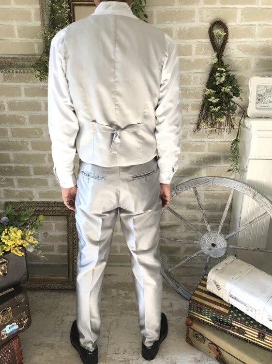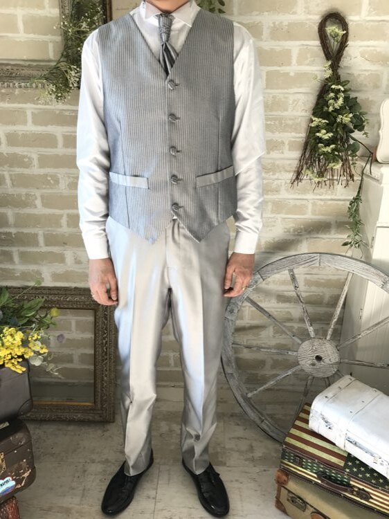明るいライトグレーシルバーのタキシード。パンツはセンターライン入りの細身のシルエット.0下襟の先がとがったピークドラぺルタイプ。ジャケット、パンツ、ベストの3ピースタイプ。ベストはチェック柄や、ブラック、ワインレッド、スモーキーピンクカラーなどのベストを差し色として合わせるのもオススメです。合わせるシャツをチェック、ドット、ストライプ、花柄、ネイビー、ブラック、グレーシャツで合わせてカジュアルな二次会タキシードとしても素敵。また白のウィングカラーシャツを合わせればきちんとした結婚式や披露宴向けのフォーマルなコーディネートになります。結婚式、披露宴・パーティースーツ・二次会・海外ウェディング・フォトウェディング、前撮りにまで幅広いシーンでご使用いただけます。オールシーズンにオススメです。
