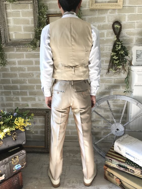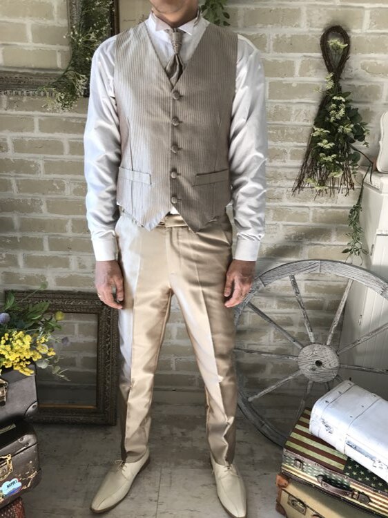 落ち着いたゴールドのタキシード。パンツはセンターライン入りの細身のシルエット.。下襟の先がとがったピークドラぺルタイプ。ジャケット、パンツ、ベストの3ピースタイプ。ベストはチェック柄や、ブラック、ワインレッド、スモーキーピンクカラーなどのベストを差し色として合わせるのもオススメです。合わせるシャツをチェック、ドット、ストライプ、花柄、ネイビー、ブラック、グレーシャツで合わせてカジュアルな二次会タキシードとしても素敵。また白のウィングカラーシャツを合わせればきちんとした結婚式や披露宴向けのフォーマルなコーディネートになります。結婚式、披露宴・パーティースーツ・二次会・海外ウェディング・フォトウェディング、前撮りにまで幅広いシーンでご使用いただけます。オールシーズンにオススメです。