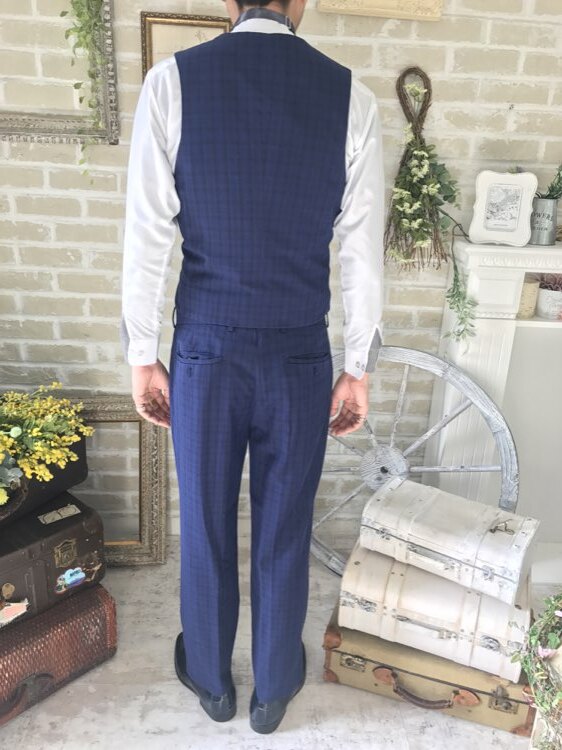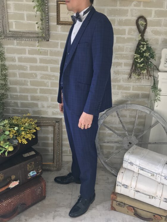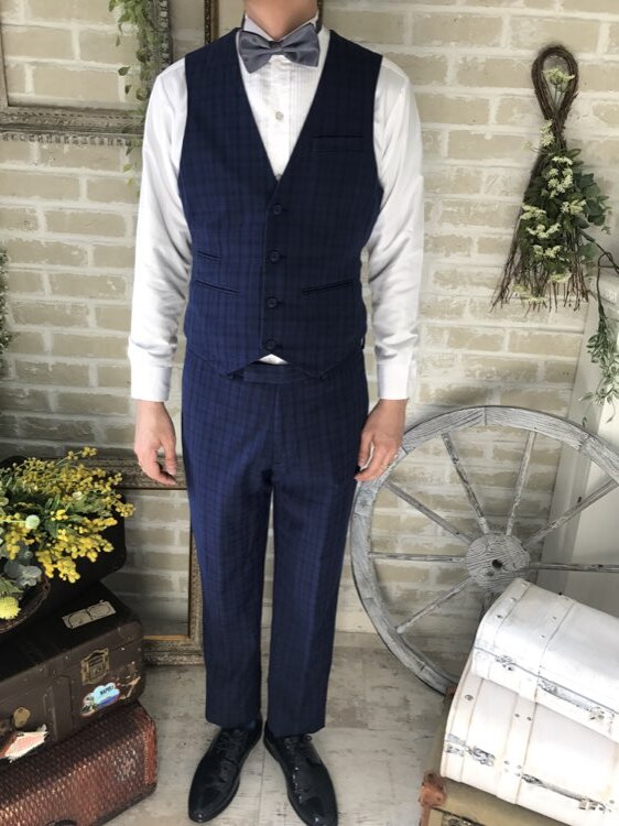 明るめなネイビーブルーのグレンチェック柄のタキシード。パンツはサイドポケット付き。バックにもポケット付き。センタークリース入り。スリムフィット―太もも、膝、足首に緩やかなラインでフィットし、レッグラインに沿ったシルエットを綺麗に創り出します。ジャケット、ベスト、パンツの3ピースで揃えてもベストのみワインレッドやグレーホワイトカラーなどのベストを差し色として合わせるのもオススメです。パンツを白デニムで合わせてもおしゃれです。合わせるシャツを水色やグレーシャツで合わせてカジュアルな二次会タキシードとしても素敵。また白のウィングカラーシャツを合わせればきちんとして爽やかなコーディネートになります。また裏地もカラフルなストライプカラーになっていておしゃれですよ。二次会の披露宴・結婚式・ゲスト結婚式の参列向け。パーティースーツ・二次会・海外ウェディング・海沿いの会場、リゾートウェディング・フォトウェディング、前撮りにまで幅広いシーンでご使用いただけます