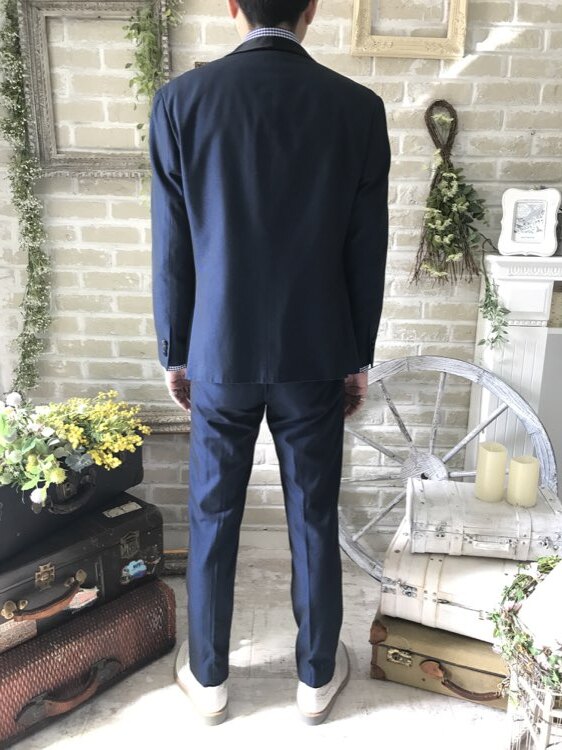 光沢のある少し明るめのネイビーのタキシード。セットのジャケットは黒のショール・カラー。パンツはサイドポケット付き。バックにもポケット付き。センタークリース入り。スリムフィット―太もも、膝、足首に緩やかなラインでフィットし、レッグラインに沿ったシルエットを綺麗に創り出します。の披露宴・結婚式・二次会までご使用いただけます。