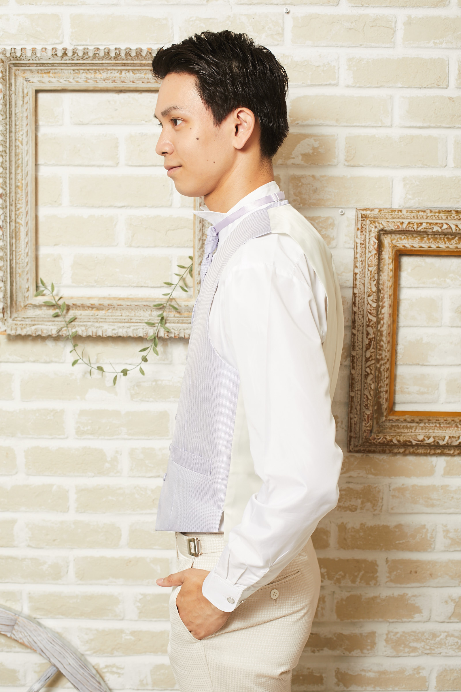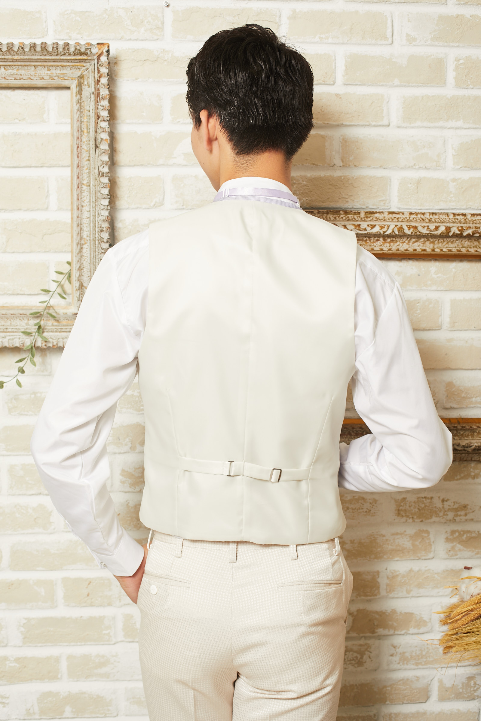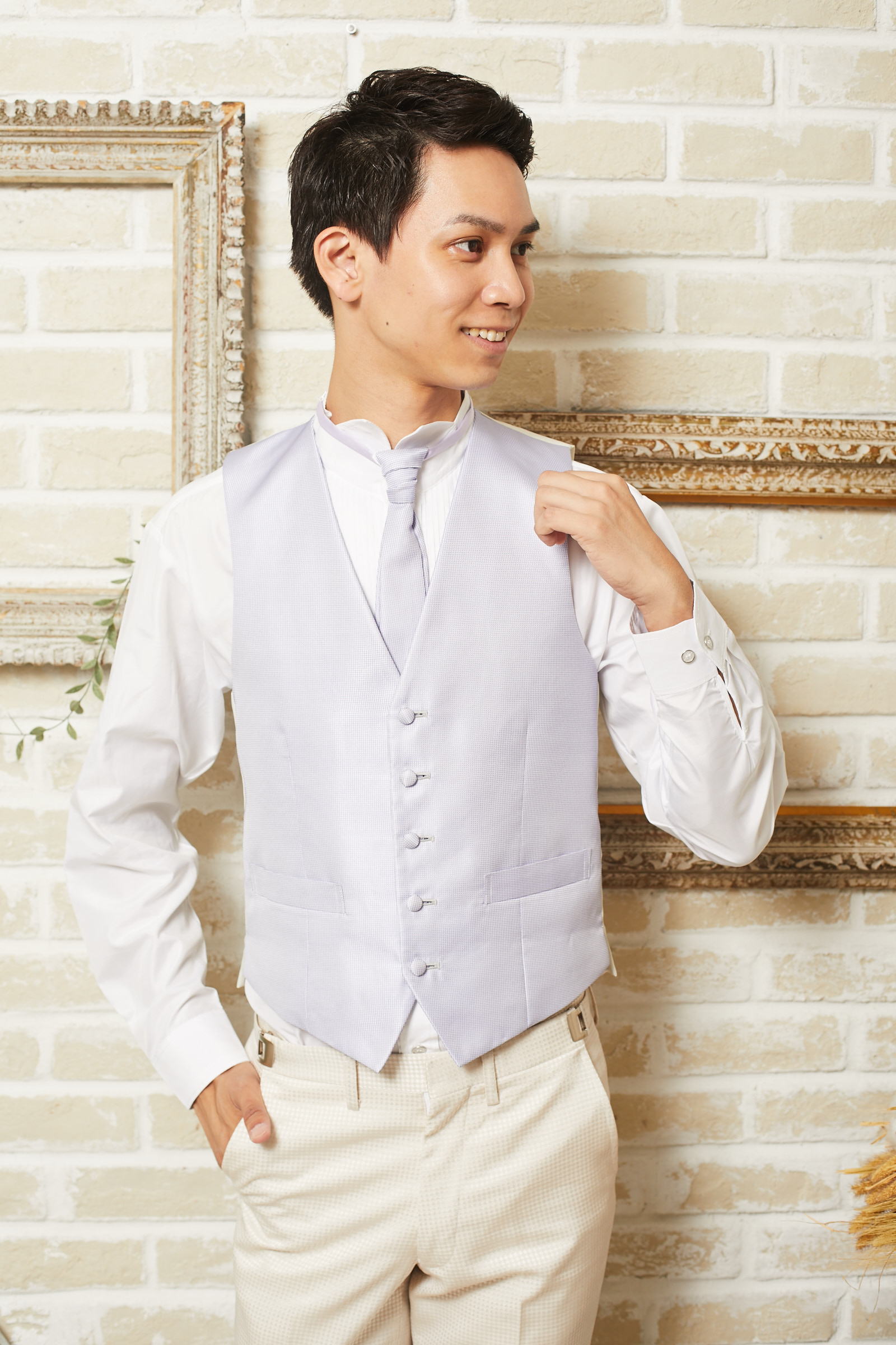 ベージュ×ピンクベージュの千鳥格子柄の光沢のあるタキシードYKJ058のセットのラベンダー無地ベストです。下襟の先がとがったピークドラぺルタイプ。ベスト、ジャケット、パンツの3ピースタイプ。合わせるシャツをチェック、ドット、ストライプ、花柄、ネイビー、ブラック、グレーシャツで合わせてカジュアルな二次会タキシードとしても素敵。また白のウィングカラーシャツを合わせればきちんとした結婚式や披露宴向けのフォーマルなコーディネートになります。披露宴・結婚式・パーティースーツ・二次会・海外ウェディング・フォトウェディング、前撮りにまで幅広いシーンでご使用いただけます。オールシーズンに適してます。