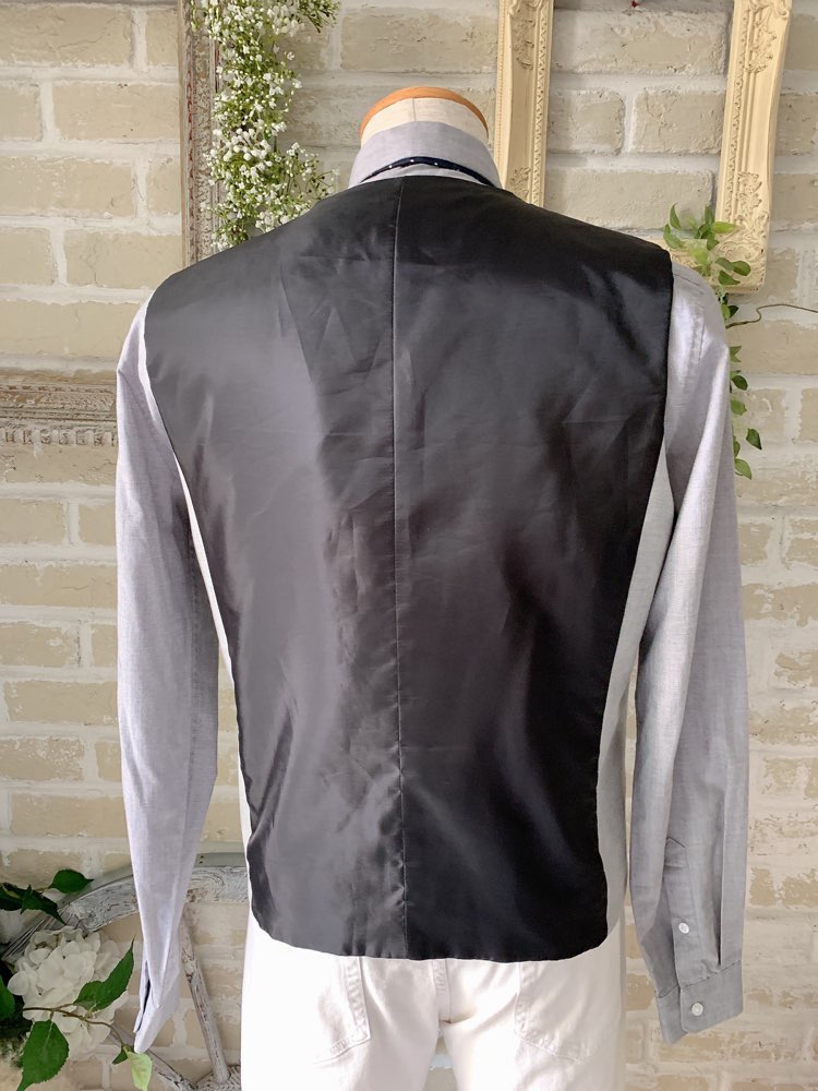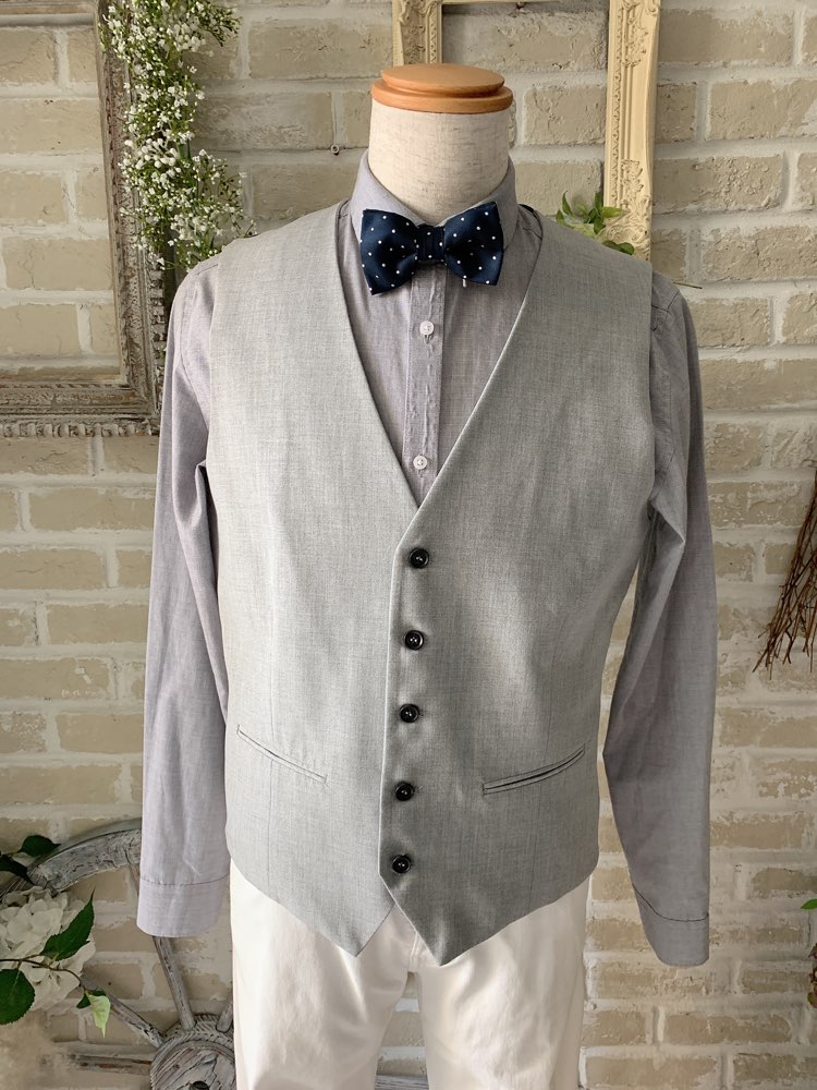 ライトグレーのシンプルで何にでも合わせやすいオールシーズン向けのベス。背中はブラックです。このベストは単品の展開です。ネイビー、グレー、ホワイト、ブラックなど無地のジャケットや、パンツはホワイトデニムや、グレー、ブラック、ネイビーの無地パンツでも合わせやすい万能なチェックベストです。また合わせるシャツをデニム素材、細かなドット柄、ネイビー、ライトブルー、ライトグレーシャツで合わせてカジュアルな二次会タキシードとしても素敵。また白のウィングカラーシャツを合わせればきちんとした結婚式や披露宴向けのフォーマルなコーディネートになります。披露宴・結婚式・ゲスト結婚式の参列向け。パーティースーツ・二次会・海外ウェディング・フォトウェディング、前撮りにまで幅広いシーンでご使用いただけます。オールシーズンに適してます。