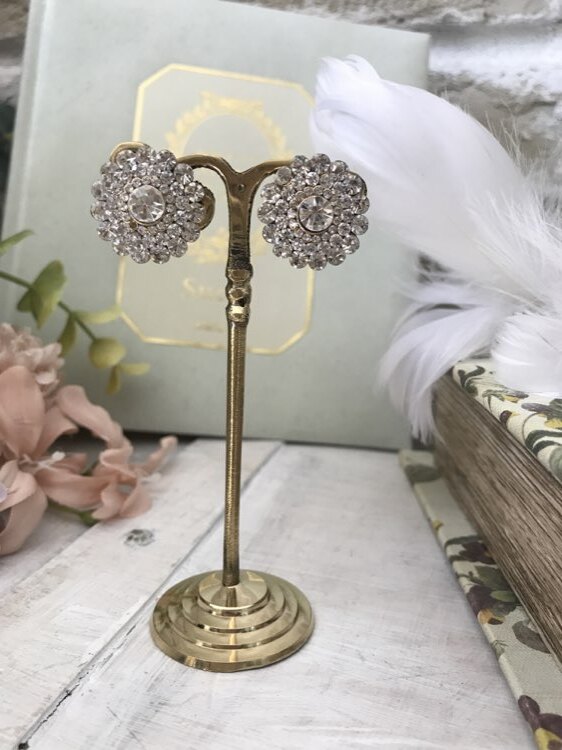 ゴールドビジューがひしめきあう丸型のゴージャスな存在感抜群のパッチ型イヤリング。 遠目からでもはっきりと感じるボリュームとキラキラとしたビジューのデザインはお顔を華やかに見せてくれる効果もございます。