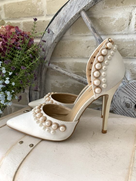 大ぶりのパールがデザインされたお洒落なホワイトカラーのパンプスです。ホワイトカラーにパールとゴールドの配色が爽やかな雰囲気を演出し、暖かい季節にもぴったりの一足です。ハイヒールですがクッション性があり、安定感があります。また、高めのヒールがスタイル良く美脚に見せる効果もあります。パーティーや女子会、など華やかなシーンにご活躍頂けます。