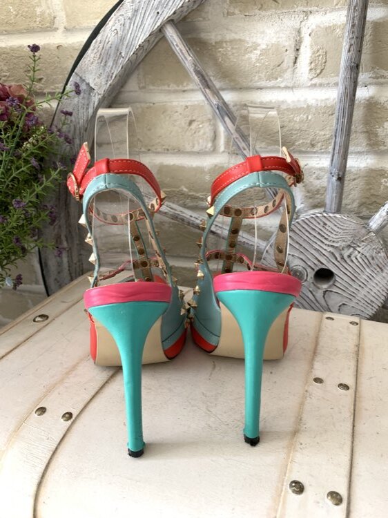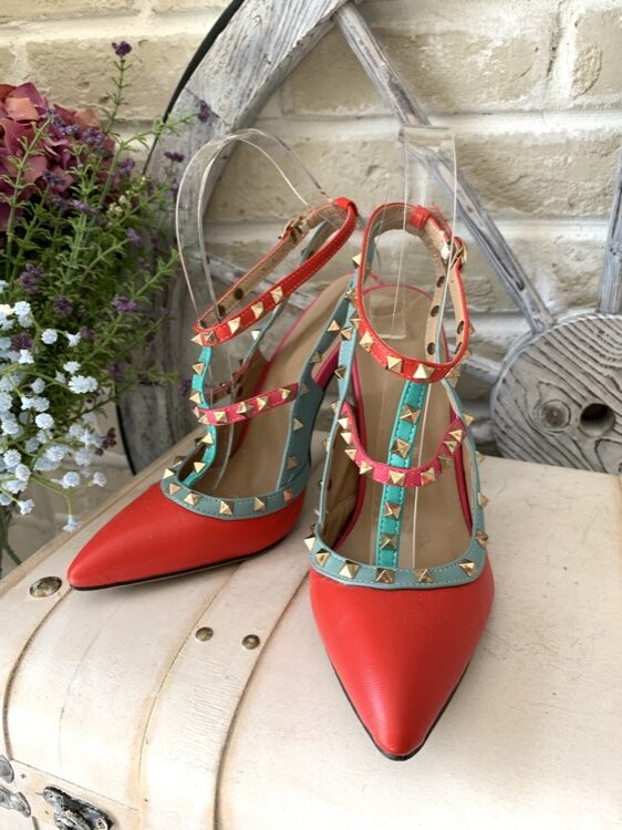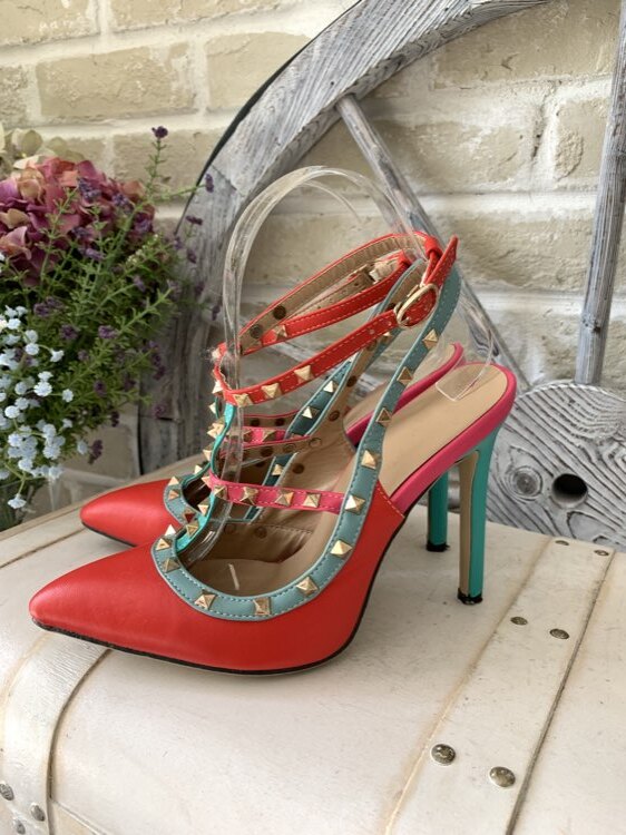 カラフルな配色にスッタズをちりばめたパンプスです。周りと被らないデザインで、遊び心があるお洒落なお客様におすすめしたい一足です。高めのヒールなのでスタイル良く美脚に見せる効果もあります。スタイリングのポイントとしてご活躍頂ける一品です。高めのピンヒールですがクッション性があり、安定感があるのでパーティーや女子会などの華やかなシーンにぴったりです。
