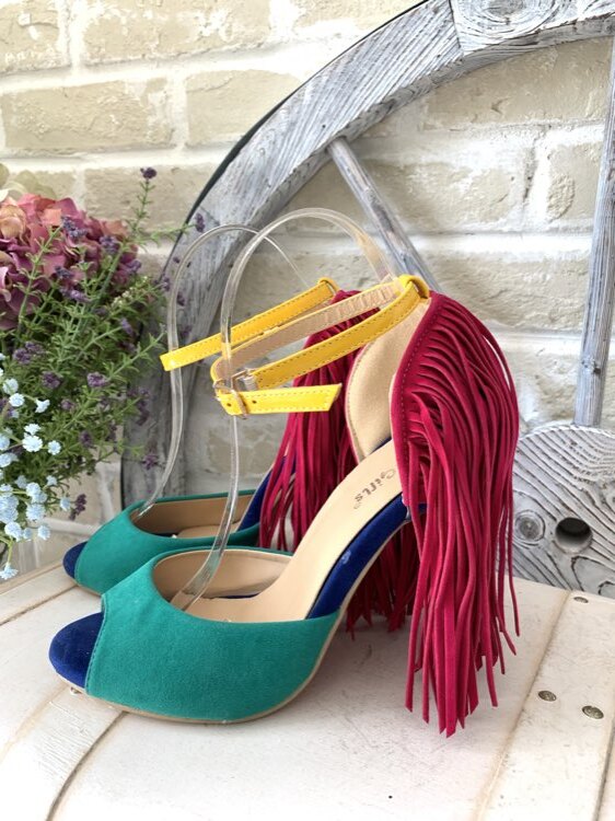 カラフルな配色にフリンジのついたお洒落なサンダルです。周りと被らないデザインで、遊び心のあるお洒落なお客様におすすめしたい一足です。高めのヒールなのでスタイル良く美脚に見せる効果もあります。スタイリングのポイントとしてご活躍頂ける一品です。高めのヒールですがクッション性があり、安定感があるのでパーティーや女子会などの華やかなシーンにぴったりです。