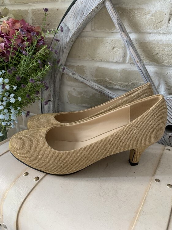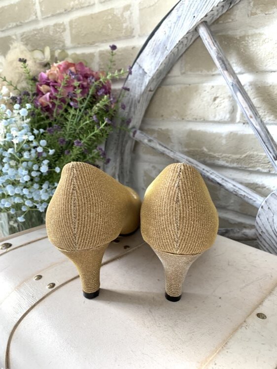 華やかで大人な印象を与えるゴールドラメのパンプスです。照明に当たるとキラキラと輝くゴールドのラメが全体的にあしらわれているので、ゴージャスでエレガントな雰囲気に。パンツスタイルとも相性抜群です。アクセサリーを同一カラーで合わせると統一感もでます。また、ヒールが低めなのでとても歩きやすくお食事会や結婚式の二次会などにぴったりです。