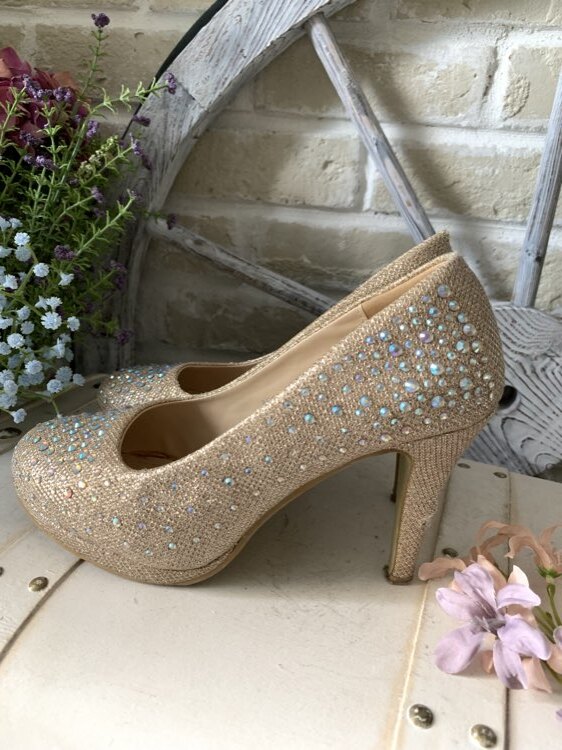 ゴールドビジューのキレイ目パンプスです。シンプルなデザインながらも、ゴールドカラーで程よい存在感があります。ヒールは高めですが、つま先部分が厚底になっているため、スタイルアップ効果はそのままに、かなりの歩きやすさを実現しました!