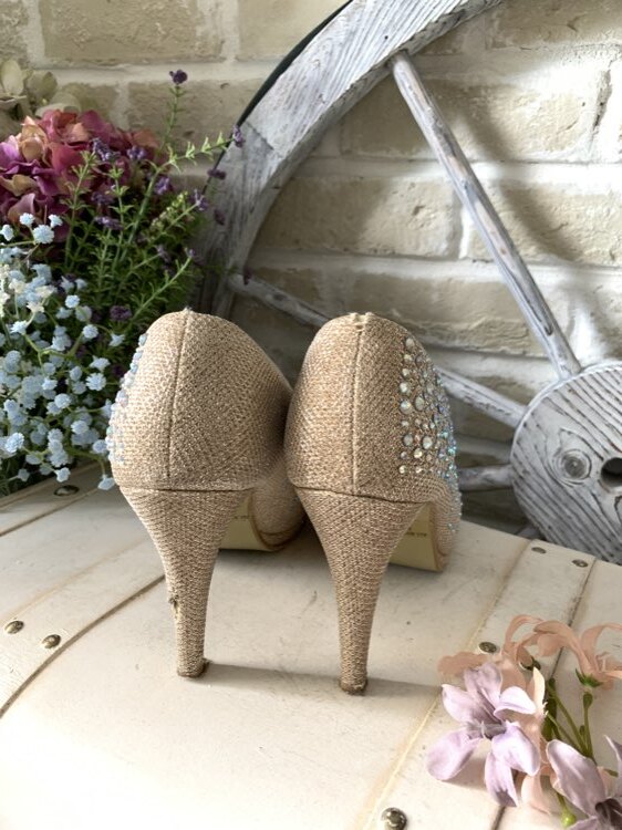 ゴールドビジューのキレイ目パンプスです。シンプルなデザインながらも、ゴールドカラーで程よい存在感があります。ヒールは高めですが、つま先部分が厚底になっているため、スタイルアップ効果はそのままに、かなりの歩きやすさを実現しました!