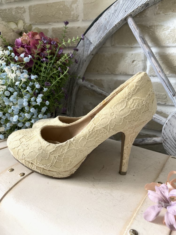 優しいクリームカラーにレースがほどこされた王道パンプスです。繊細なレースが気品溢れる印象をあたえます。どんなドレスとも相性が良いお色味なのも嬉しいポイント♪