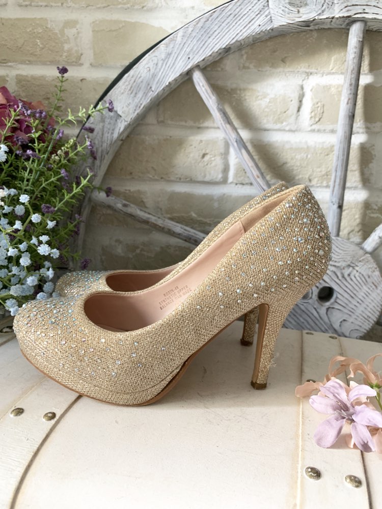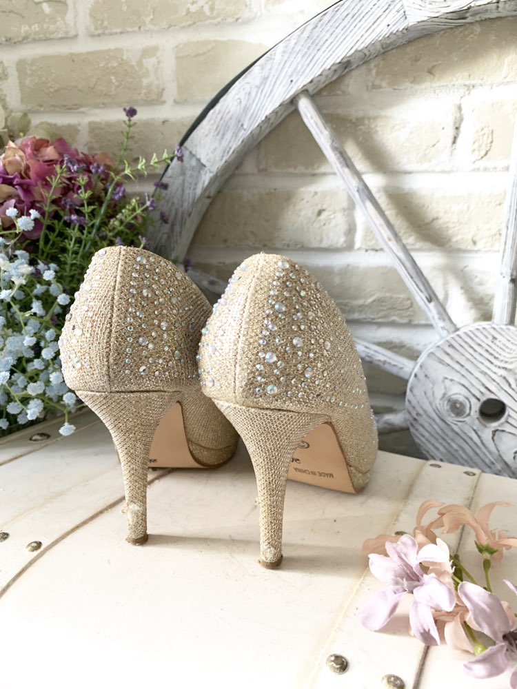 ゴールドビジューのキレイ目パンプスです。シンプルなデザインながらも、ゴールドカラーで程よい存在感があります。ヒールは高めですが、つま先部分が厚底になっているため、スタイルアップ効果はそのままに、かなりの歩きやすさを実現しました! ゴールド系のアクセサリーとも相性が良く、小物同士でカラーを合わせると統一感もでます。 シンプルなデザインなのでどんなドレスとも相性抜群です。 ご親族の結婚式、同窓会、お食事会、女子会など幅広くお使い頂ける一足です。