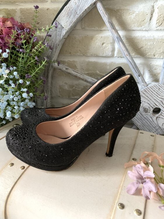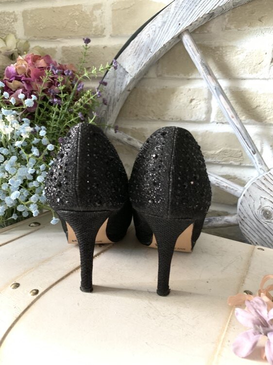 ブラックベースにブラックストーンがたくさん散りばめられた当店でも大人気の1足。かっこよくも、エレガントな雰囲気にもなります。モノトーンコーディネートや、ブラックフォーマルな時にオススメです。