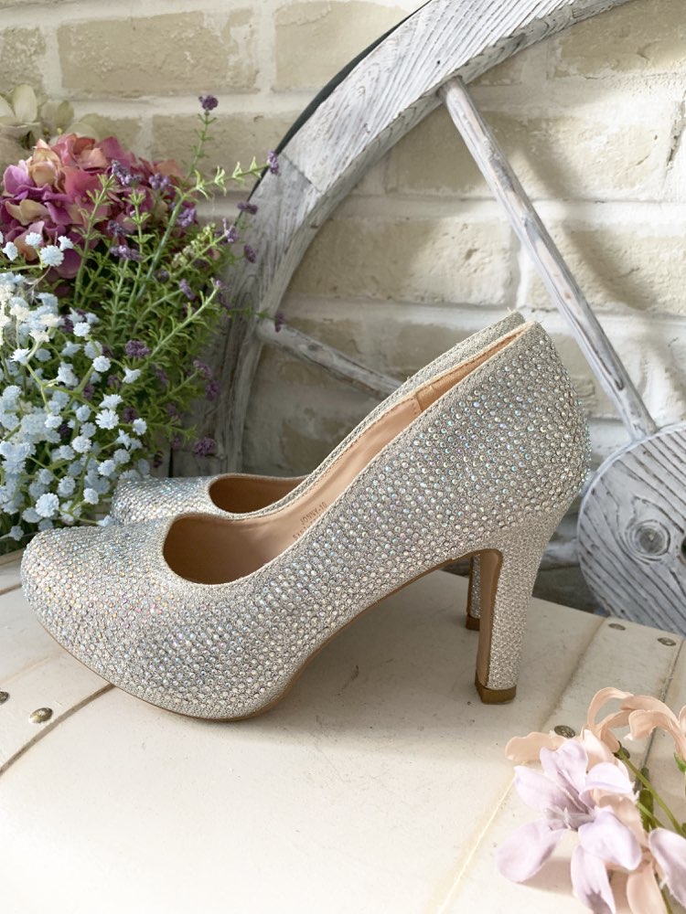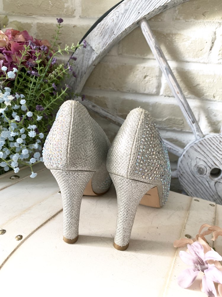 シルバービジューのキレイ目パンプスです。シンプルなデザインながらも、シルバーカラーで程よい存在感があります。ヒールは高めですが、つま先部分が厚底になっているため、スタイルアップ効果はそのままに、かなりの歩きやすさを実現しました!