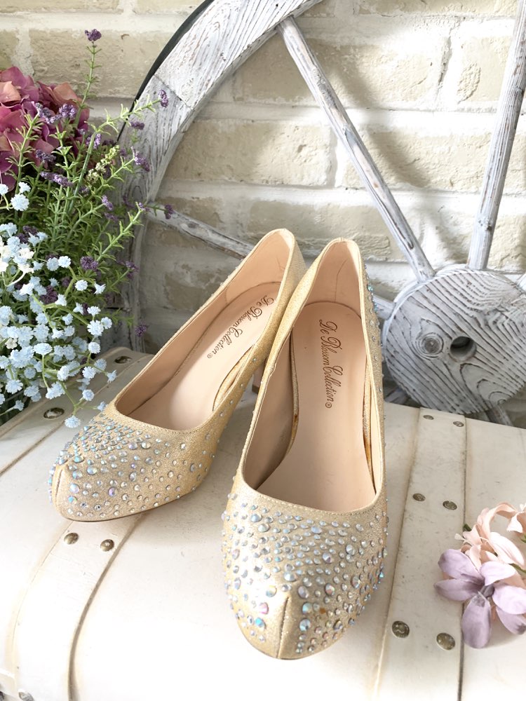De Blossom Collection 大粒ビジュー付きゴールドパンプス