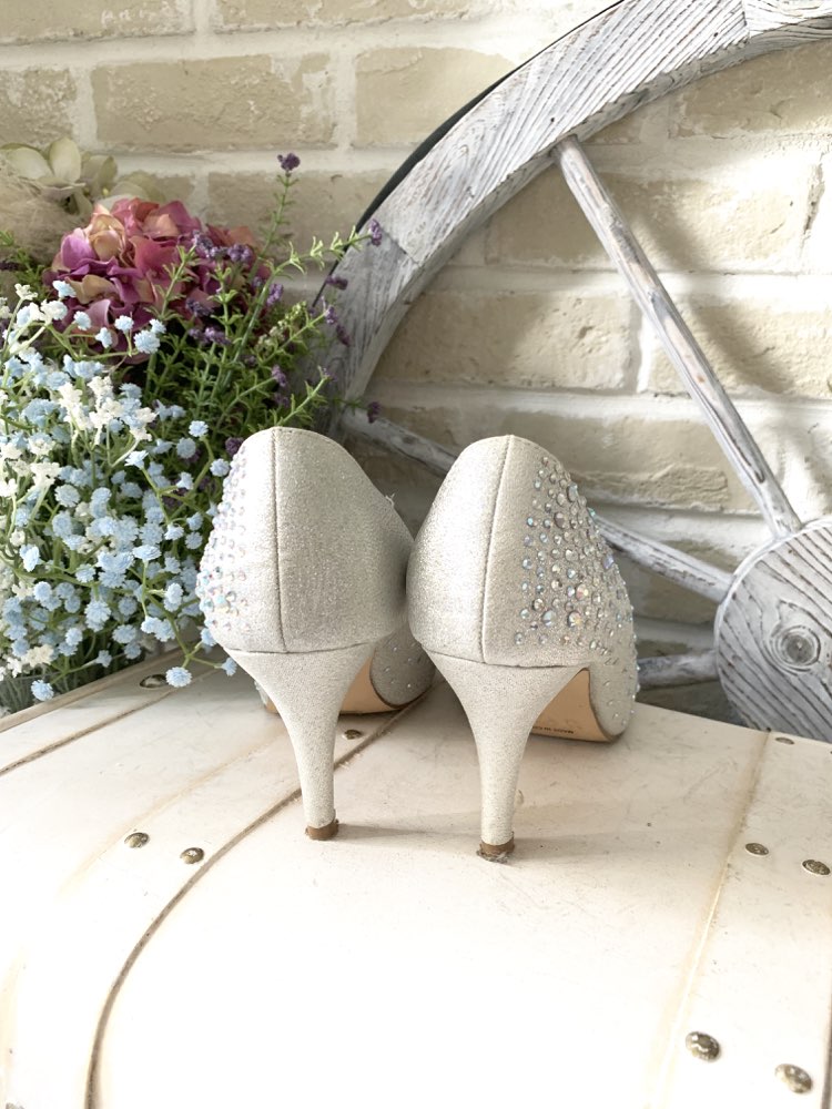 シルバービジューのキレイ目パンプスです。シンプルなデザインながらも、シルバーカラーで程よい存在感があります。8㎝ヒールで、女性の足元をきれいに演出してくれる高さです。