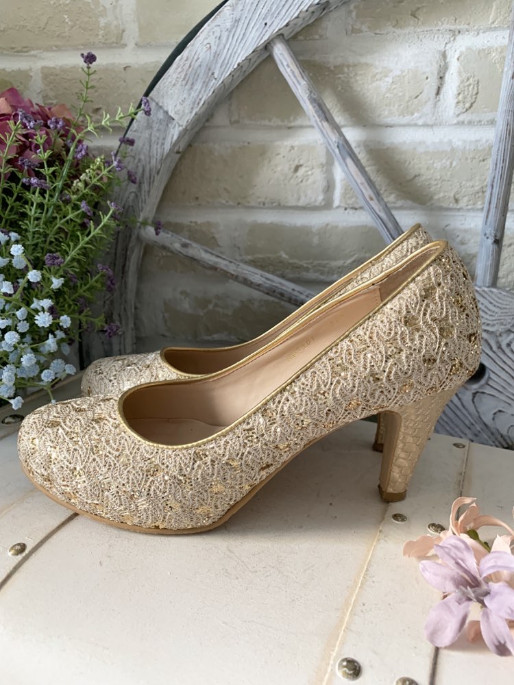 ゴールドのラメが全体にあしらわれた、ゴージャスでエレガントなパンプスです。ゴールドカラーなのでどんなドレスとも相性抜群です。靴はどれにしようかな?と困った時にも安心です◎ パンツドレスと合わせれば、カッコイイ感じにも。 しっかりとしたソールに、ポインテッドトゥで長時間歩いても疲れを感じさせません。 アクセサリーやバッグにゴールド系をチョイスすれば一気に統一感がでます。 思った以上に肌なじみの良い色なので迷ったらコレ!というくらいオススメの1足。 サイズ展開も豊富に取り揃えております。