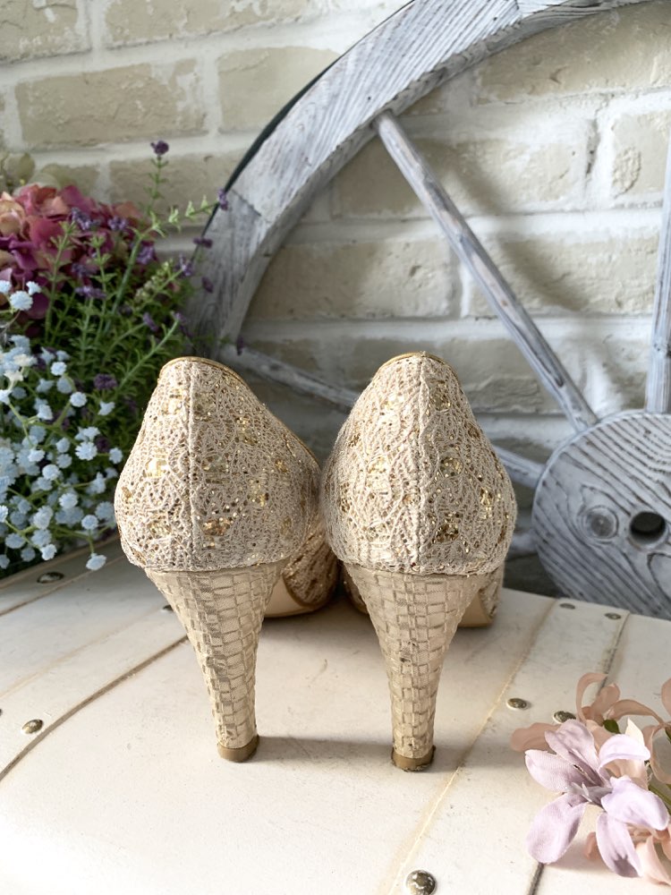 ゴールドのラメが全体にあしらわれた、ゴージャスでエレガントなパンプスです。ゴールドカラーなのでどんなドレスとも相性抜群です。靴はどれにしようかな?と困った時にも安心です◎