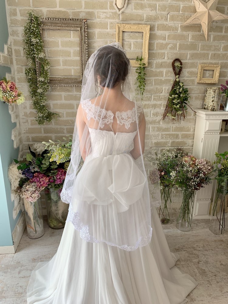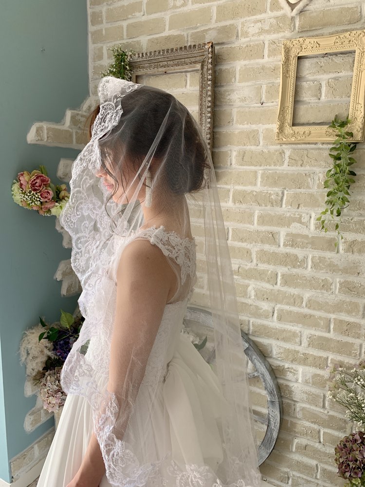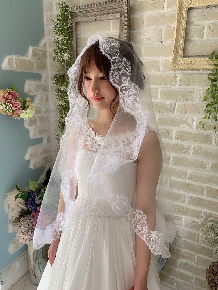 永遠の花嫁定番ウェディングベール・レースマリアベールです。ラグジュアリーなレースが非常に美しく、エレガントで上品な花嫁様に。日本製の柔らかいチュールとレースを使用し、繊細な印象に仕上がります。 チュールのお色がどのお色のドレスにも合わせやすい色味に調節されているのも嬉しいポイント!