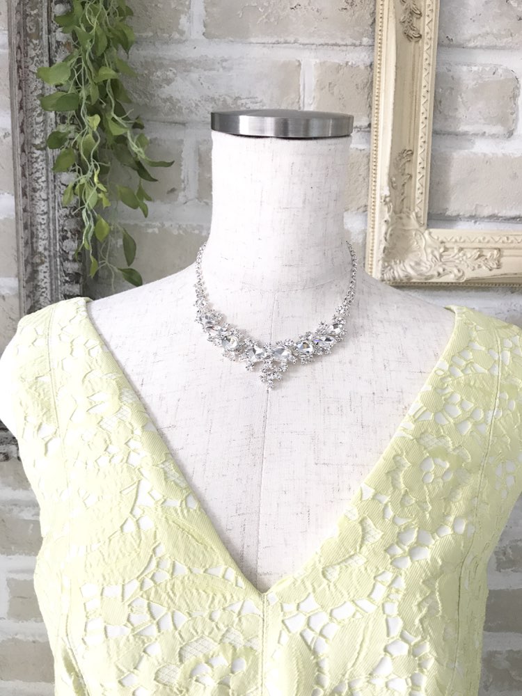 大小大きさや形の異なったシルバーダイヤがいたゴージャスで素敵なチョーカーネックレスです。パーティーやお祝いの席にぴったりのほどよいボリューム感と華やかさが使いやすさ◎。 胸元のあきが気になるドレスやシンプルなドレスにプラスすれば、デコルテを華やかに演出してくれます。