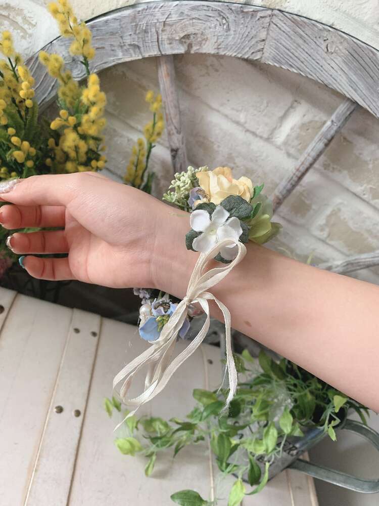 まるでブーケみたいなボリュームたっぷりのフラワーリストブーケ。髪飾りにかすみ草などを合わせると統一感が出てGOOD!花嫁様向けに披露宴や二次会にはもちろん、マタニティーの方向けにフォト撮影やベビーシャワーにもおすすめの1点です。