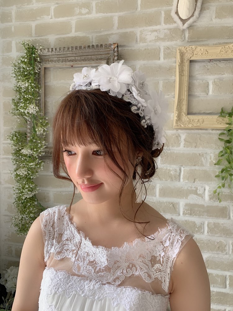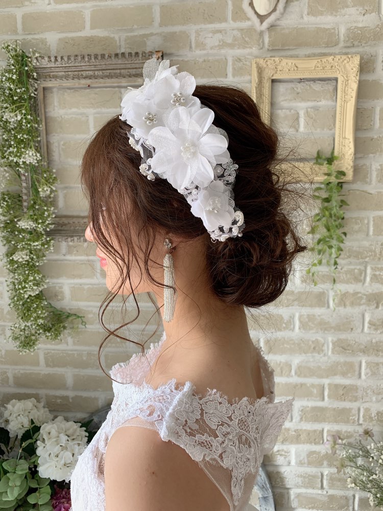 真っ白で統一されたお花が印象的なヘッドドレス。主役級の存在感をはなちながらも、ホワイトカラーが清楚感を醸し出します。可愛らしい雰囲気の花嫁様にオススメの一点です。 前撮りにはもちろん、二次会等にもぜひご利用ください。