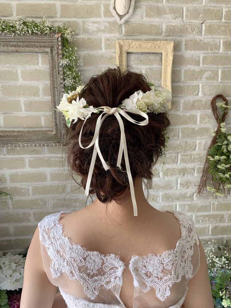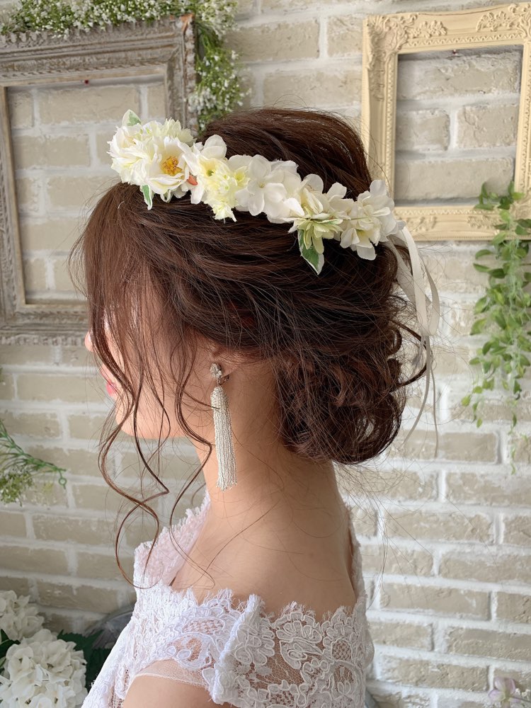 ホワイトカラーを基調とした清楚感溢れる花冠です。着けるだけで優しい印象になります。カジュアルなエンパイアドレス等に合わせれば、トレンドのスタイルの完成です。 ガーデンウエディングにはもちろん、ベビーシャワー等にもオススメの一点です。