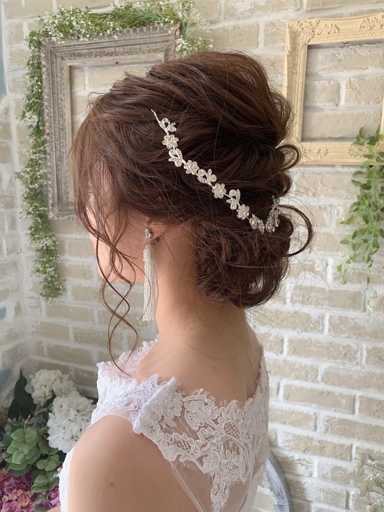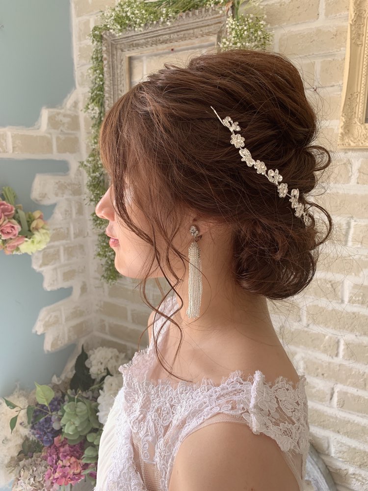 枝から葉や花が咲き誇り力強く伸びつ様が凛とした雰囲気を醸し出してくれる一点です。ナチュラルなデザインなので、派手になりすぎず、花嫁様の上品さをより一層際立たせてくれることでしょう。ヘアスタイルによって可愛らしくも、大人っぽくもなり様々な表情を 引き出してくれます。