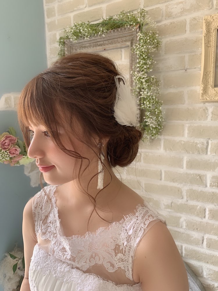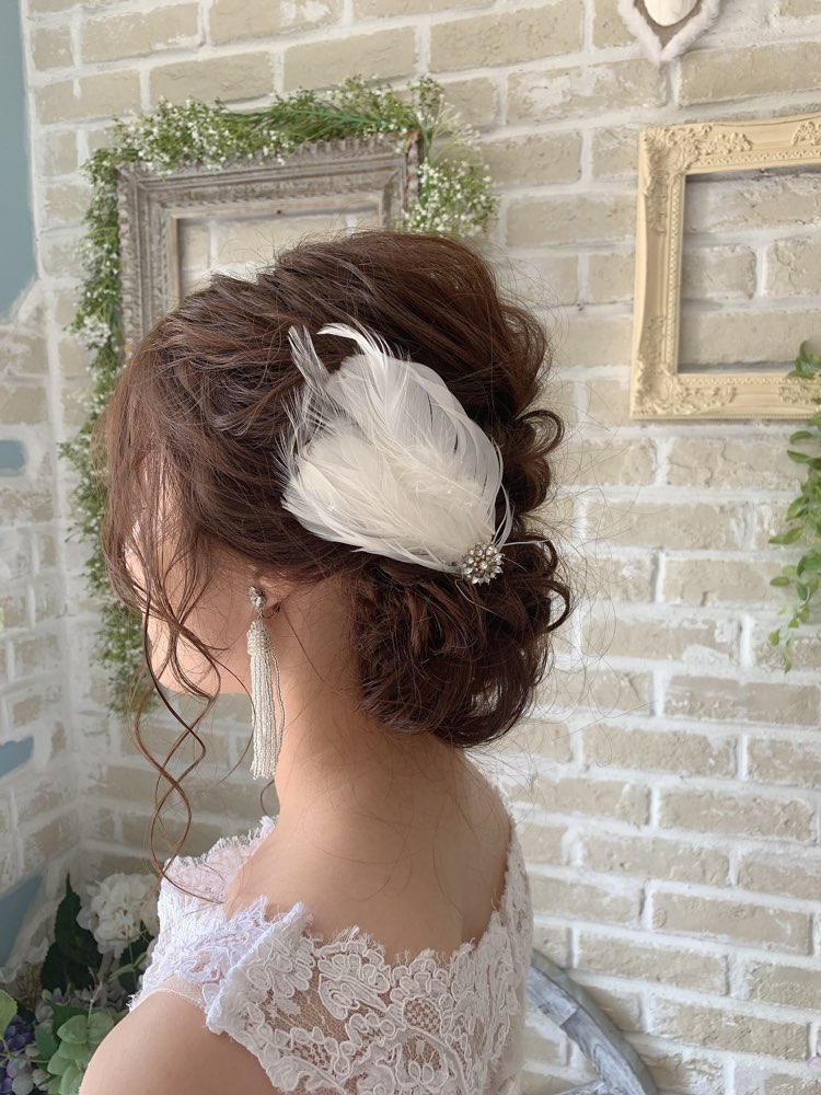 女性らしい柔らかな印象の羽が上品なヘッドアクセサリー。程よくあしらわれたビジューで華やかなイメージに。サイドに着けたり、まとめ髪の周りに着けたり、花嫁様らしいらしいスタイルでお召しいただけます。 披露宴にはもちろん、ガーデンウエディング等にもオススメの1点。