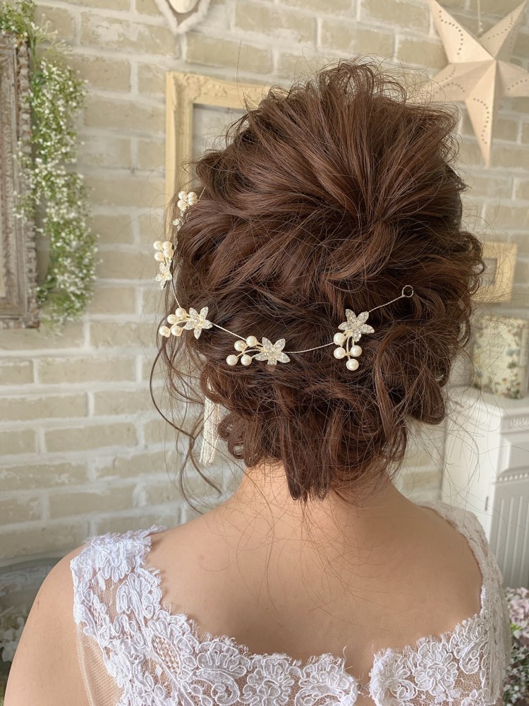 枝から葉や花が咲き誇り力強く伸びつ様が凛とした雰囲気を醸し出してくれる一点です。ナチュラルなデザインなので、派手になりすぎず、花嫁様の上品さをより一層際立たせてくれることでしょう。ヘアスタイルによって可愛らしくも、大人っぽくもなり様々な表情を 引き出してくれます。
