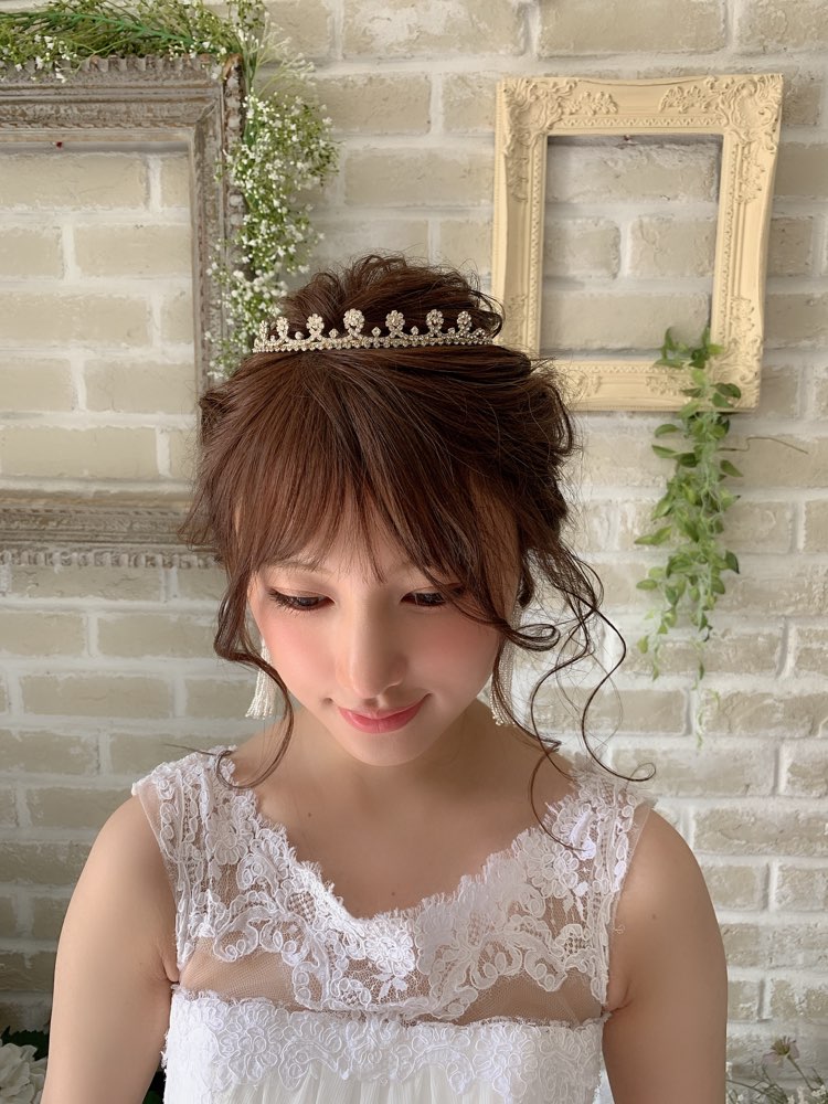 ゴールドの輝きが上品な正統派ティアラ。程よい存在感で、気品のある印象を与えます。披露宴にはもちろん、ロケーションでの前撮りや、ウエディングフォトにもオススメの1点です。