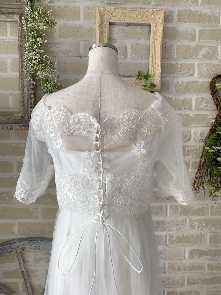 大きいサイズXXL以上対応の花嫁ウェディング二次会向けオフホワイトオフショルダー後ろ編み上げレースボレロ