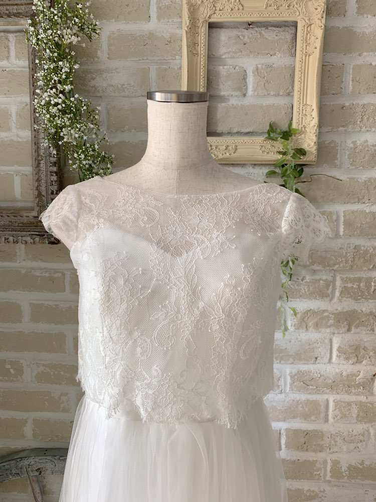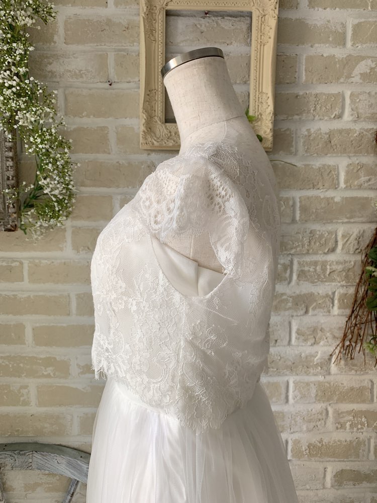 レースのデザインで、スッキリとした印象のレースボレロです。全面レースで可愛らしい印象に仕上げ、女性らしい魅力を引き出してくれます。シンプルですが、華やかな装いにもぴったりの一品。 女性らしいデザインが沢山盛り込まれてはいますが、可愛くなり過ぎないのは、短い袖と軽やかな生地感のおかげ♪ 幅広いシーンやドレスにも相性抜群です。