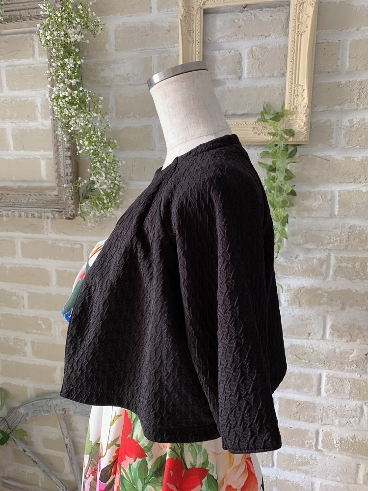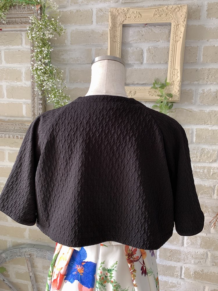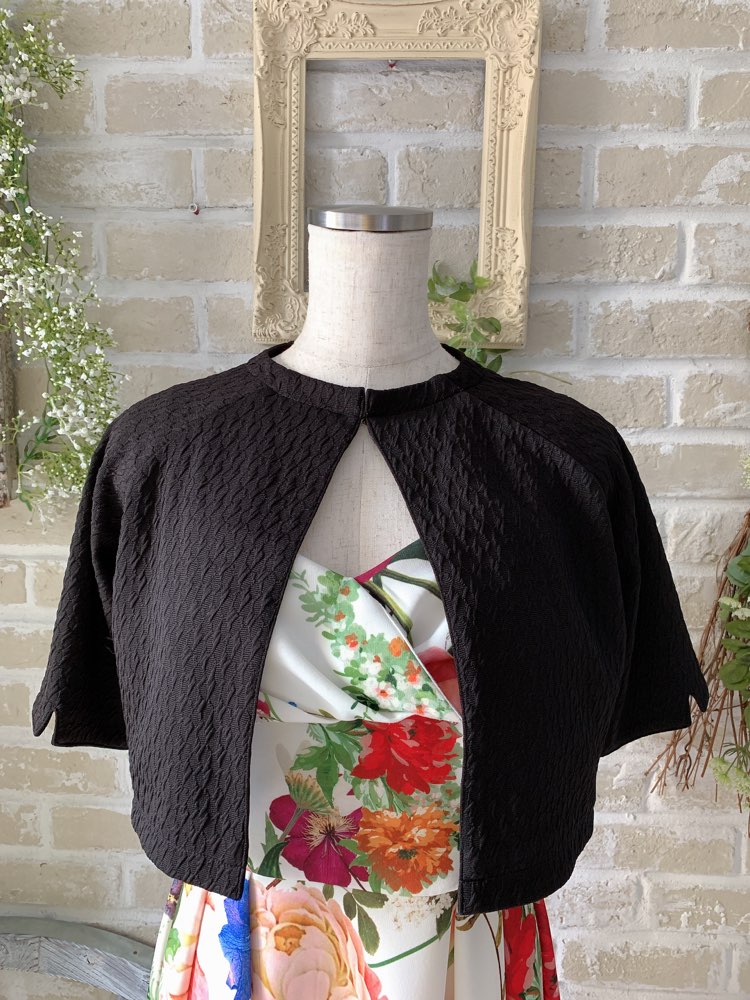 厚手のデザインで、スッキリとした印象のブラックボレロです。フレア袖がふんわりとエアリーな印象に仕上げ、女性らしい魅力を引き出してくれ、二の腕カバーにも一役買ってくれます。シンプルですが、華やかな装いにもぴったりの一品。 シックな大人っぽい印象のボレロです♪