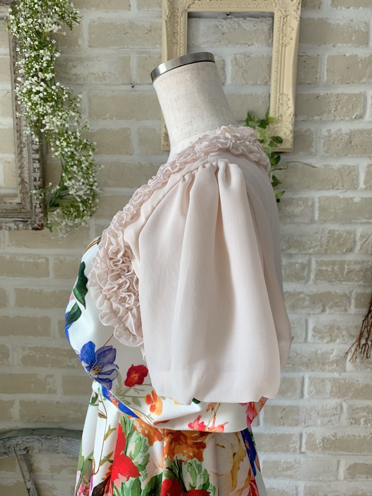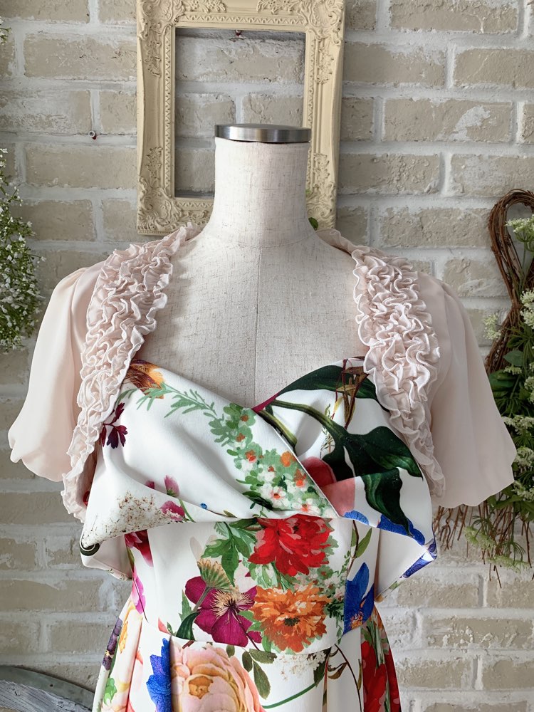 フリルとフレアののデザインで、可愛らしい印象のベージュボレロです。首元のフリルがふんわりとエアリーな印象に仕上げ、女性らしい魅力を引き出してくれます。シンプルですが、腕のフレアが入って、華やかな装いにもぴったりの一品。 女性らしいデザインが沢山盛り込まれてはいますが、可愛くなり過ぎないのは、ベージュカラーと軽やかな生地感のおかげ♪ 幅広いシーンやドレスにも相性抜群です。