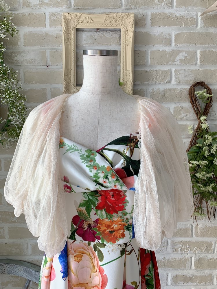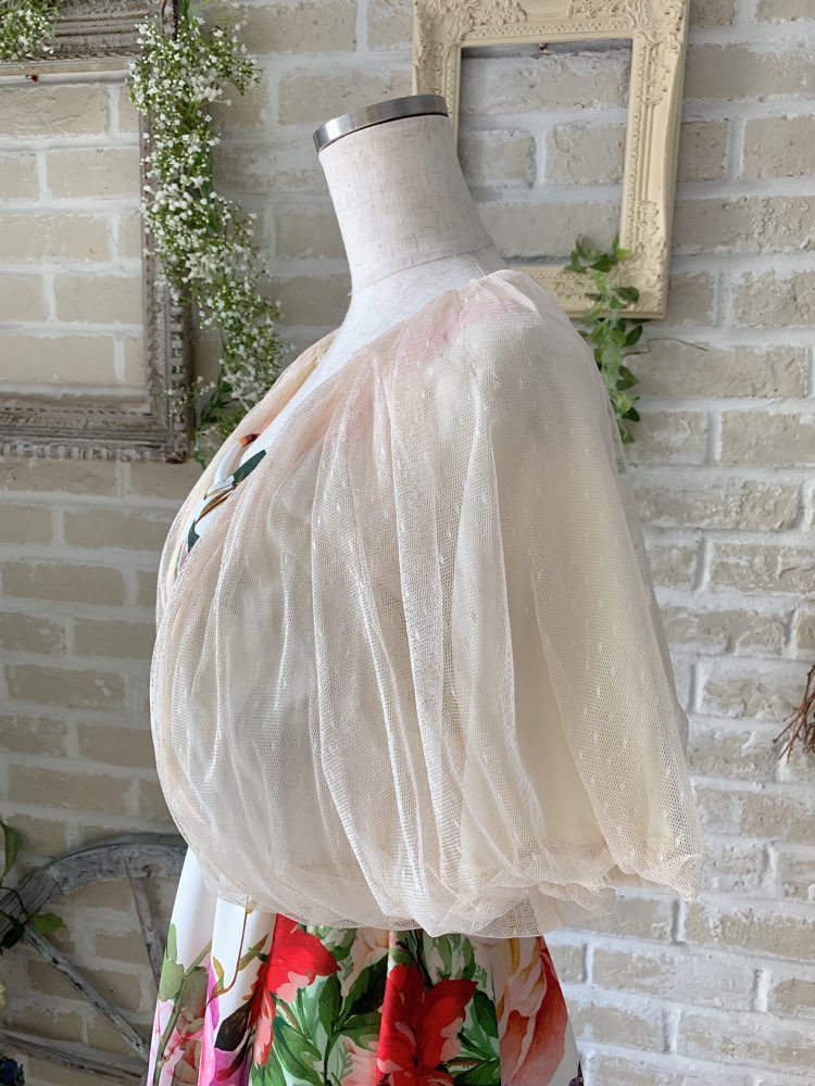 チュール地ドット柄アイボリードレープ五分袖ボレロ