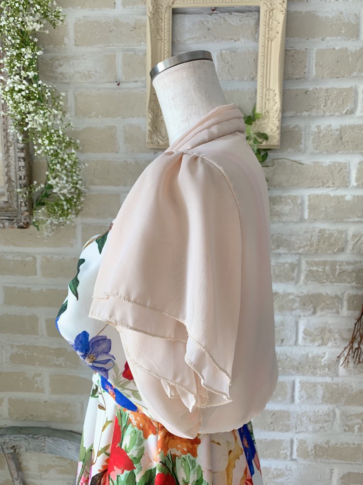袖はフレアが重なったデザインで、ふんわりとした印象のピンクベージュボレロです。フレア袖がふんわりとエアリーな印象に仕上げ、女性らしい魅力を引き出してくれ、二の腕カバーにも一役買ってくれます。シンプルですが、裾に絞りの入ったデザインで、華やかな装いにもぴったりの一品。 女性らしいデザインが沢山盛り込まれてはいますが、可愛くなり過ぎないのは、ピンクベージュカラーと軽やかな生地感のおかげ♪ 幅広いシーンやドレスにも相性抜群です。