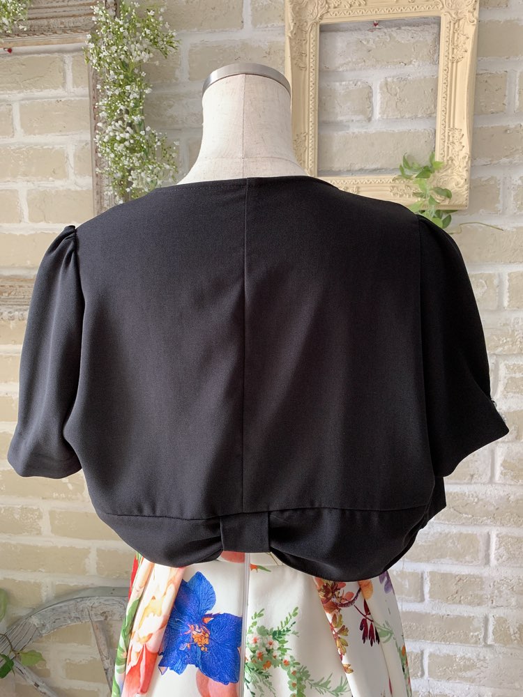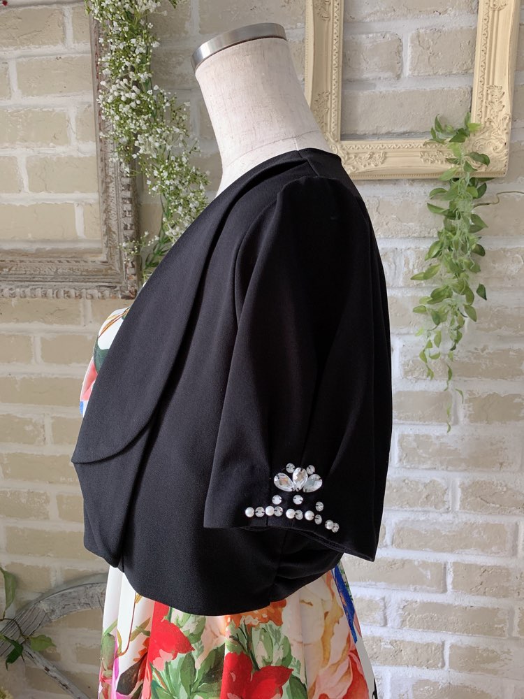 ジャケットとボレロの中間のようなジャレロ風のデザインで、スッキリとした印象のブラックボレロです。袖に大粒ビーズをつけ大人っぽいな印象に仕上げ、女性らしい魅力を引き出してくれ、二の腕カバーにも一役買ってくれます。シンプルですが、背面の裾にリボンのデザインも入って、華やかな装いにもぴったりの一品。 女性らしいデザインが沢山盛り込まれてはいますが、可愛くなり過ぎないのは、ブラックカラーと軽やかな生地感のおかげ♪ 幅広いシーンやドレスにも相性抜群です。