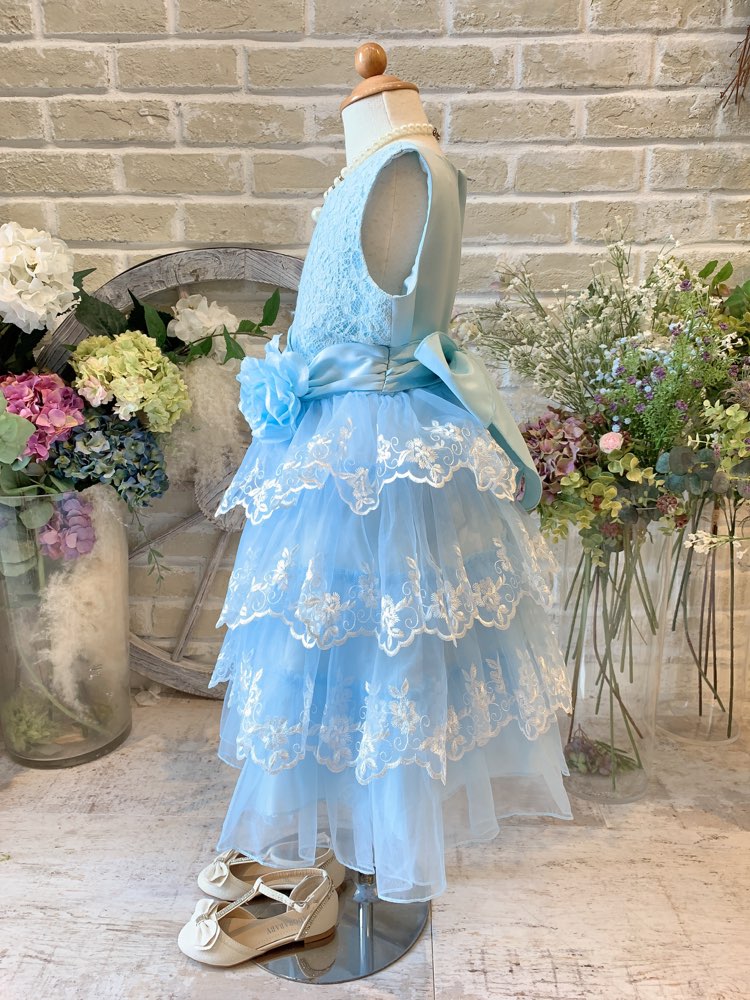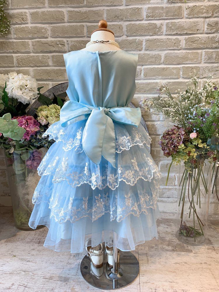 爽やかなブルーは、透明感のある印象を与えます。爽やかでクールそして清楚なイメージはフォーマルな場面にぴったり! ウエストのりボンに縫い付けられたコサージュが子供らしい可愛らしさも演出♪ 結婚式やピアノの発表会・コンクールやパーティーなど大切な一日にぜひ。