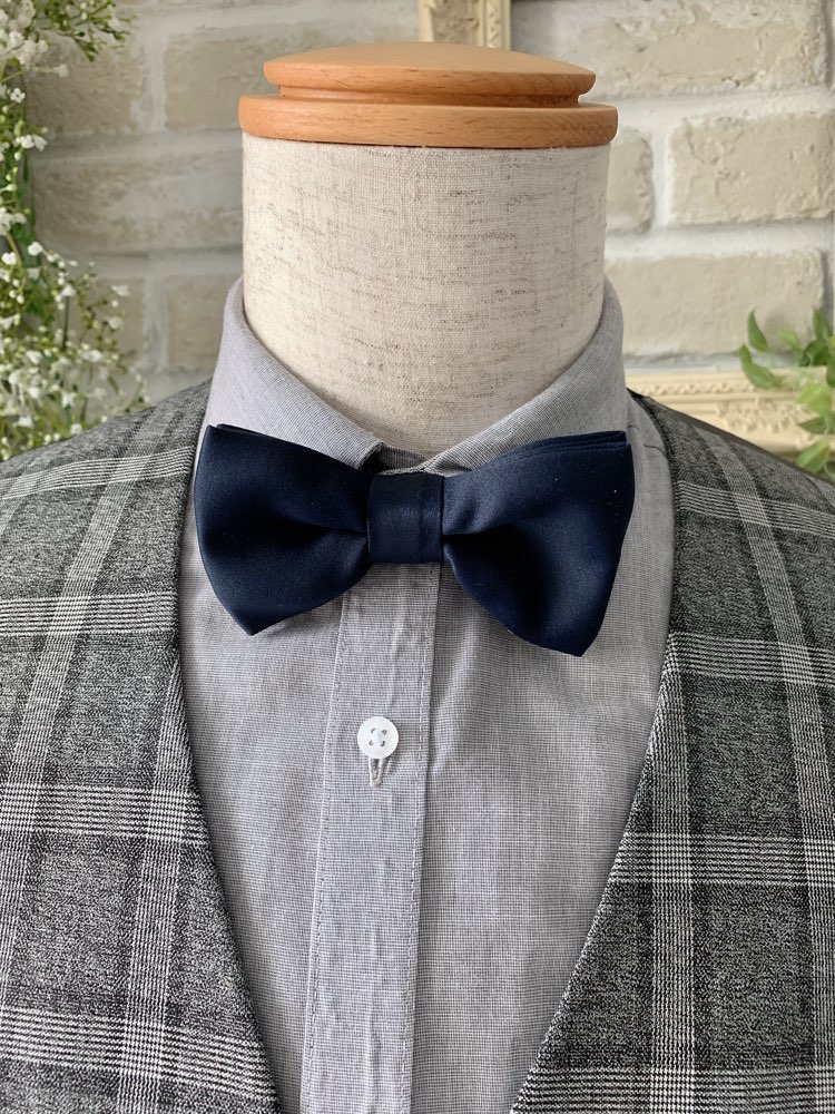 結婚式や披露宴・1.5次会・2次会・パーティーシーンにお勧めな蝶ネクタイ。深みのある濃紺はブラックタキシードと合わせるとニュアンスの違いをさりげなく演出してくれます。フォーマルタキシード・カジュアルジャケット等どんなアイテムとも相性の良い万能カラーです。フックタイプで装着が簡単、長さ調節が可能です。