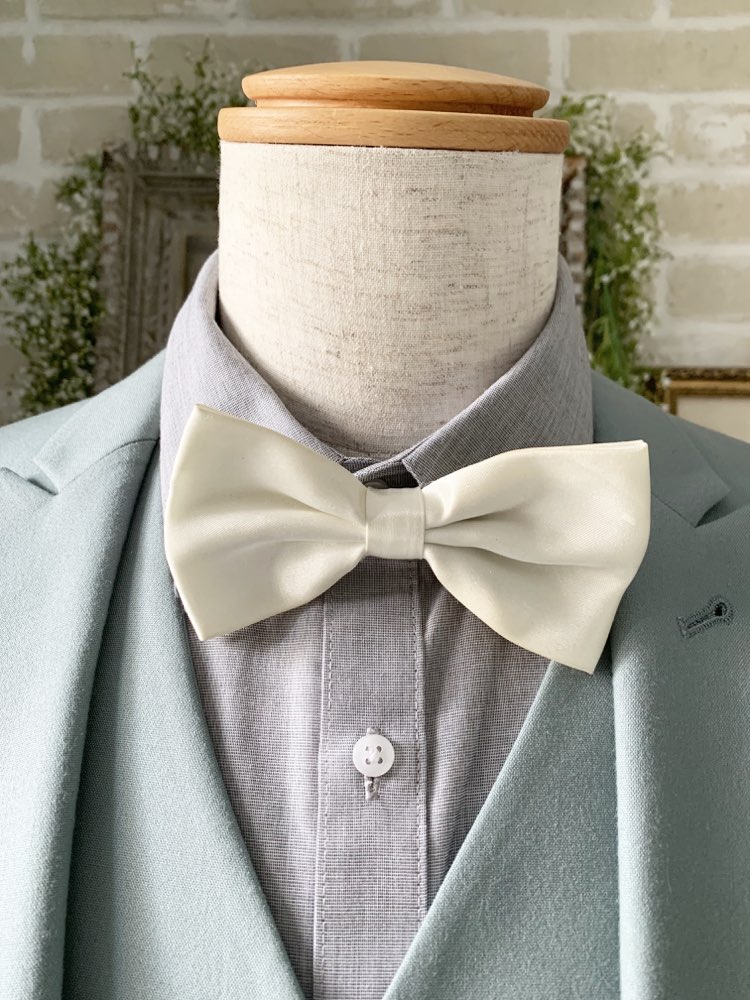 結婚式や披露宴・1.5次会・2次会パーティー新郎向き蝶ネクタイ。柔らかみがあり親近感のある優しい印象に。サテンで光沢感があるのでフォーマルウエディングにもぴったりです。白・ブラック・グレー・ベージュ系のタキシードと相性が良いです。フックタイプで装着が簡単、長さ調節が可能です。