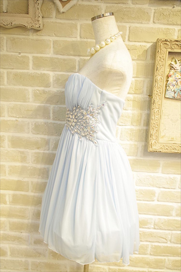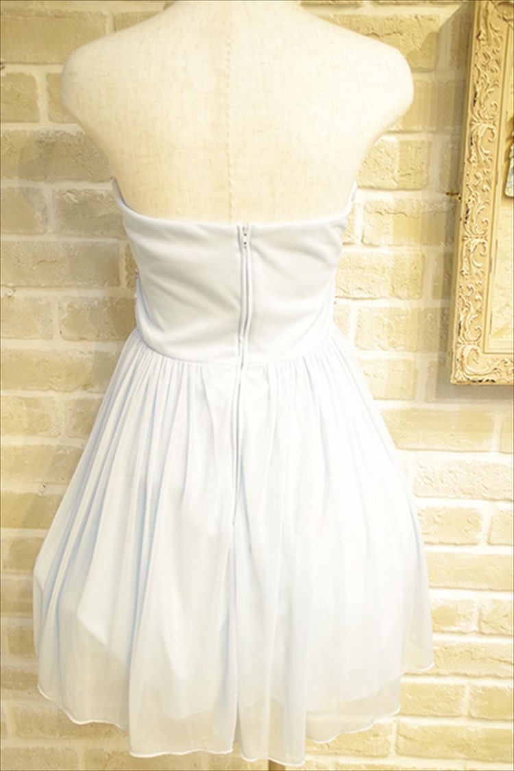 綺麗なアイスルーカラーが印象的なシンプルなドレスです。ウェストについたシルバーのキラキララビジューが華やかで、かわいいベアミニフレアドレスです。パニエを入れるとよりふわっとして華やかになりますよ。ミニ丈なので結婚式二次会や謝恩会パーティーにオススメです。