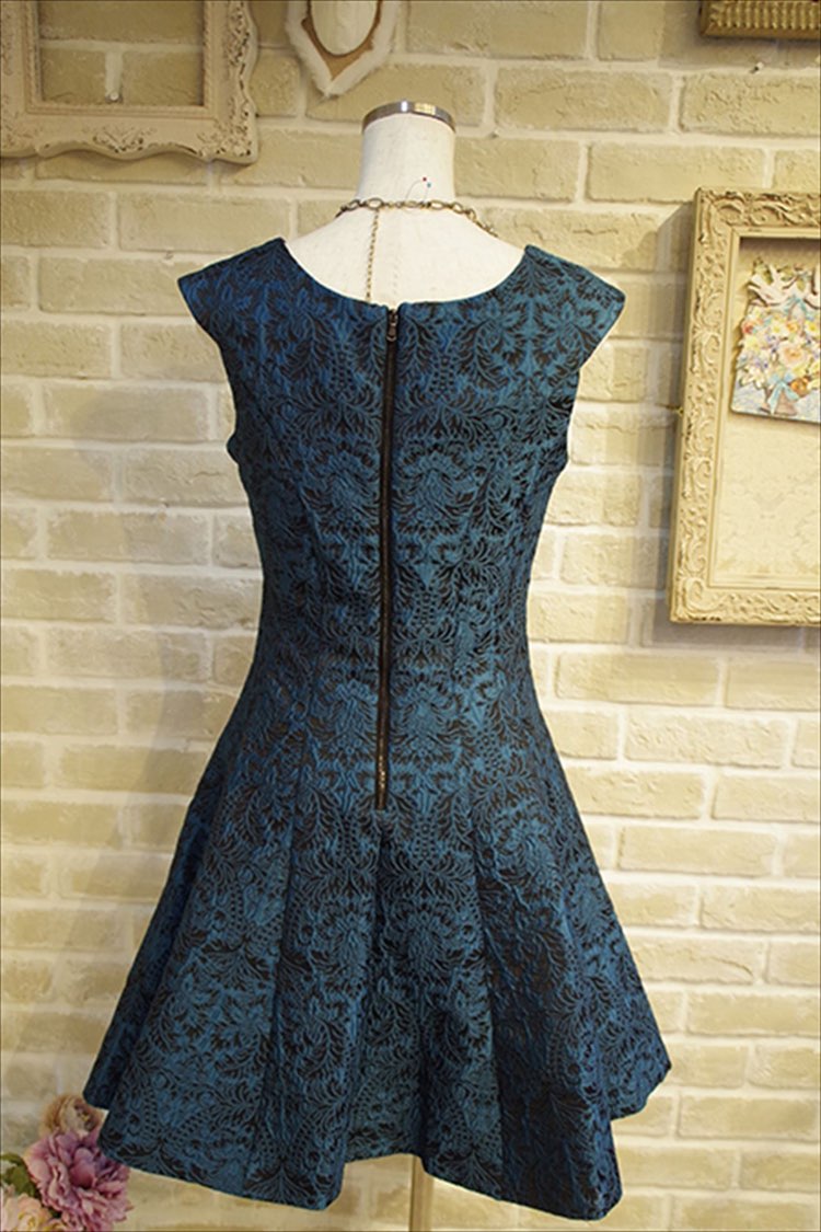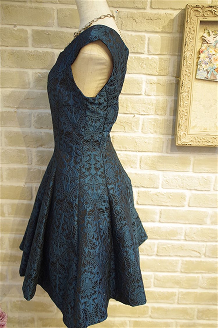 デコルテラインが綺麗に開いていてダークグリーンに全ダマスク柄がとっても印象的なフレアドレス。キュートなデザインと大人なカラーで甘すぎない着こなしに仕上がります。全体のダマスク柄が華やかなので、ネックレスは小ぶりなデザインでも素敵♪ウェストもシェイプされたデザインでとっても綺麗なシルエットに見せてくれます。