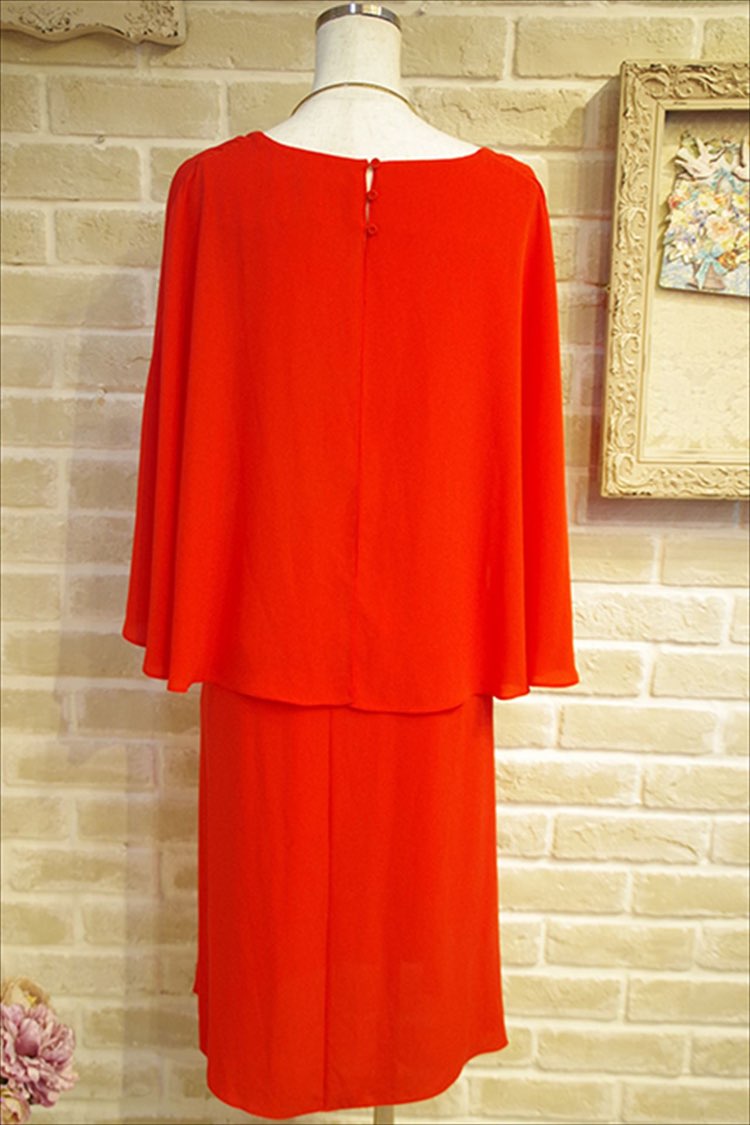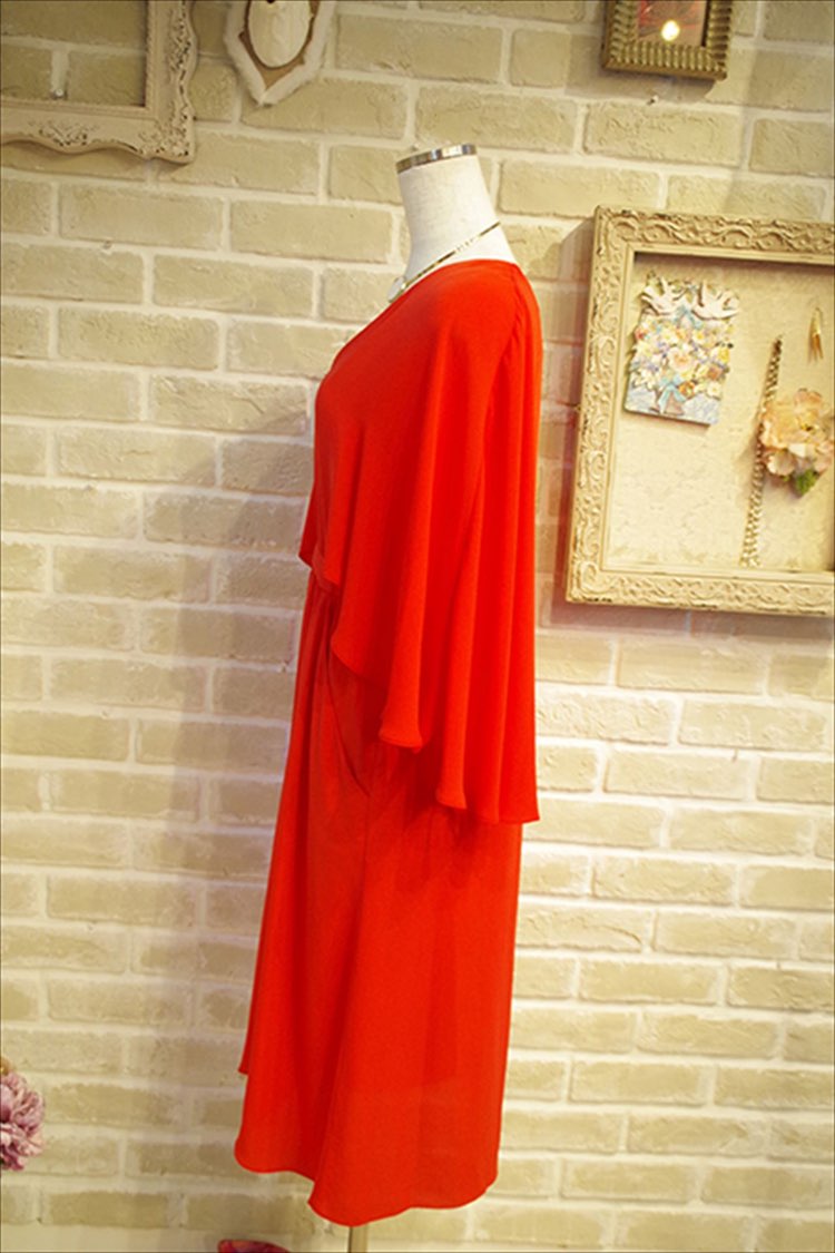 BCBGのトップスがマント風のドレープフレアスリーブのひざ下ドレスです。一枚でさらっとおしゃれに着ていただけます。高いに切り替えがあるので脚長効果も抜群です。シンプルなドレスなので大きめのアクセサリーをつけるのがオススメです。バックもビジュー付きのものなど華やかなデザインのものを合わせるのがオススメです。