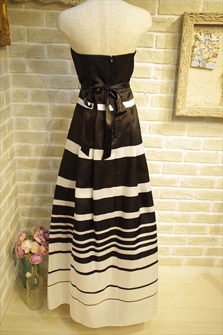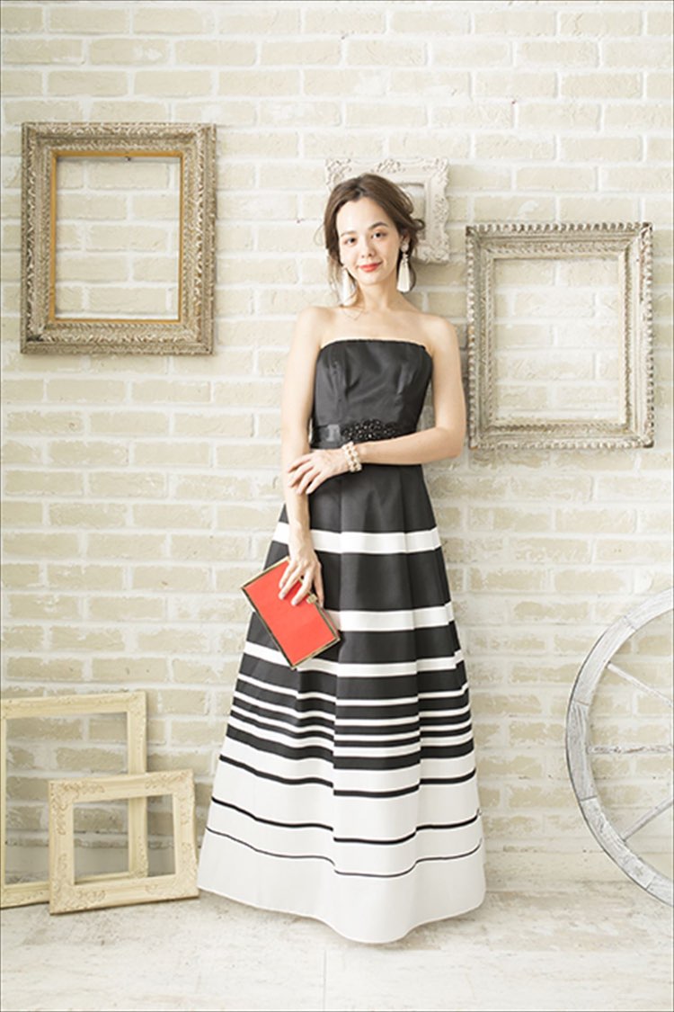 ブラック×ホワイトのボーダー柄が他の方とは絶対被らない個性的なドレスです。幅広めのボーダーが華やかで主役級な着こなしへと導いてくれます。またパニエを入れることで一層ボリュームも出て素敵ですよ。ウェストについたビジューがとても華やかで大人かわいい女性にぴったりです。パーティーや花嫁さんの二次会パーティー、演奏会にもオススメです。ウェスト切り替えデザインなので着痩せ効果抜群です。気になる腰周りもしっかりカバーしてくれますよ。 合わせるアクセサリーでより華やかな表情をプラスできます。