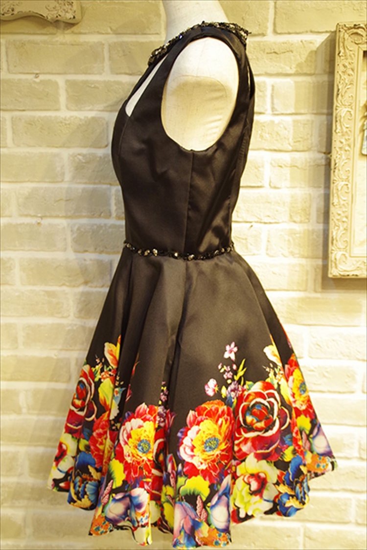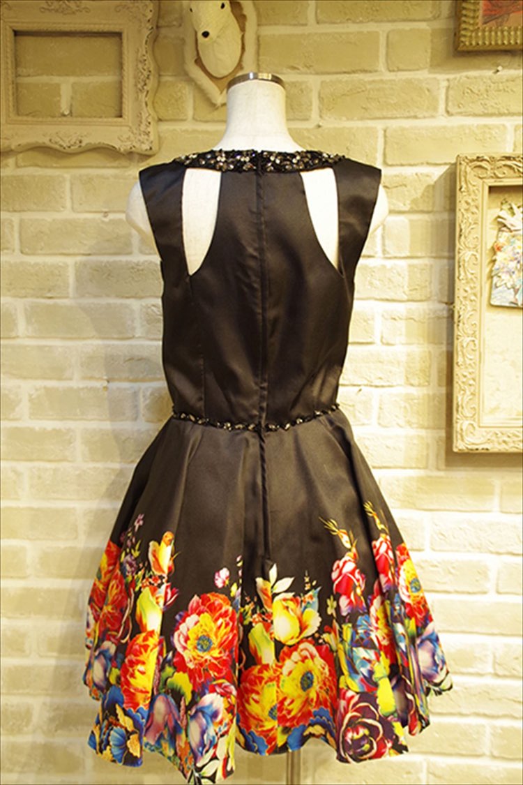 ブラックカラーにカラフルなフラワー柄が印象的なフレアドレス。首元とウェストについたビジューとフロントと背中に空いたデザインもとっても個性的で人と被ることのないドレスです。立体的な構造ですっきりと綺麗なウェストラインに見せてくれます。ハリのある素材と着丈長めなのできちんと感もあり、大人かわいい女性にぴったりです。パーティーや結婚式、結婚式の二次会パーティーにもオススメです。丈感も長めなので上司の結婚式やご親族の結婚しにも適してます。スカートはハリのある素材を使用しているのできちんと感もでます。。控えめなリボンのついたウェスト切り替えでで着痩せ効果抜群です。気になるお腹周りもしっかりカバーしてくれますよ。