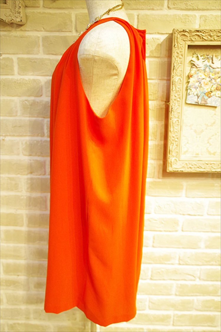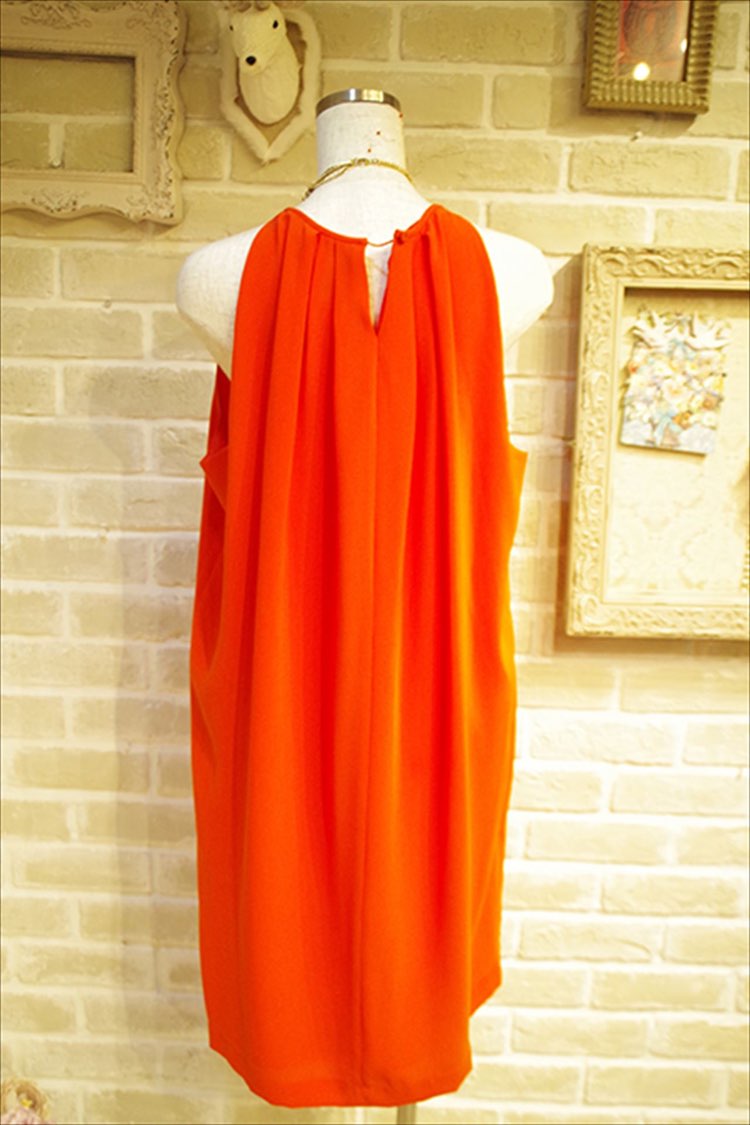 ぱっと目を引く朱色カラーのAラインのドレス。オレンジと赤の中間のような絶妙な色合いでこなれ感抜群で写真映え間違いなしです!胸元を飾るゴールド系の装飾が大人コーデに一役。