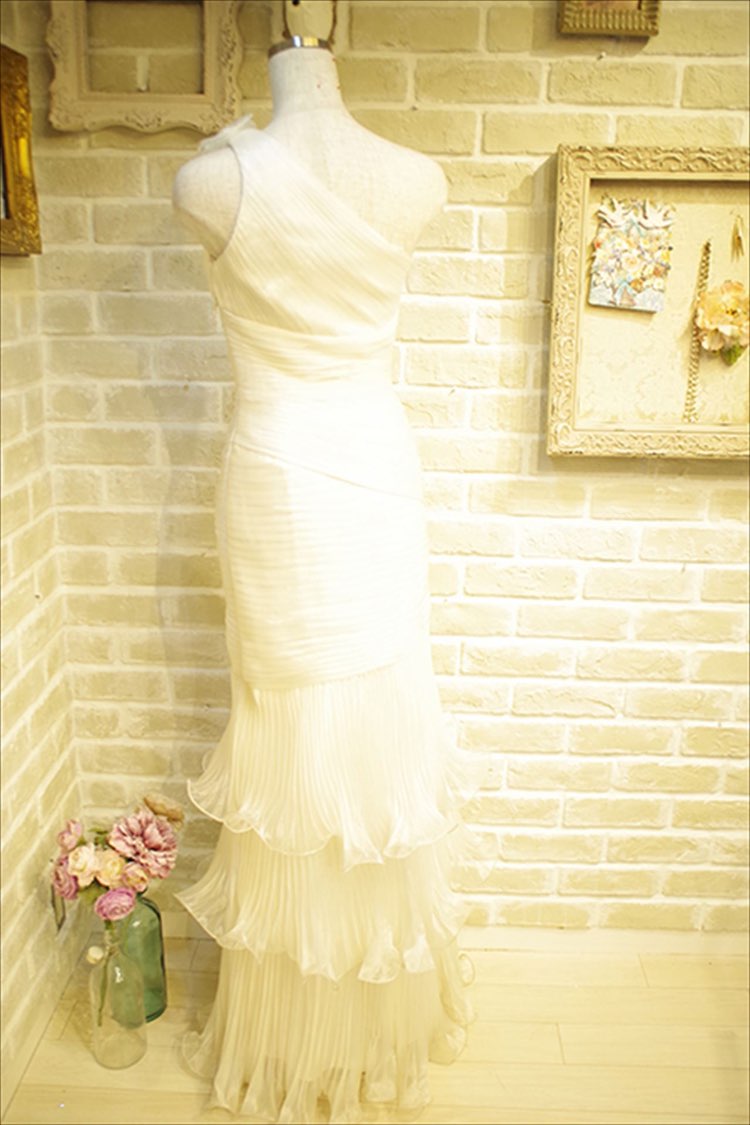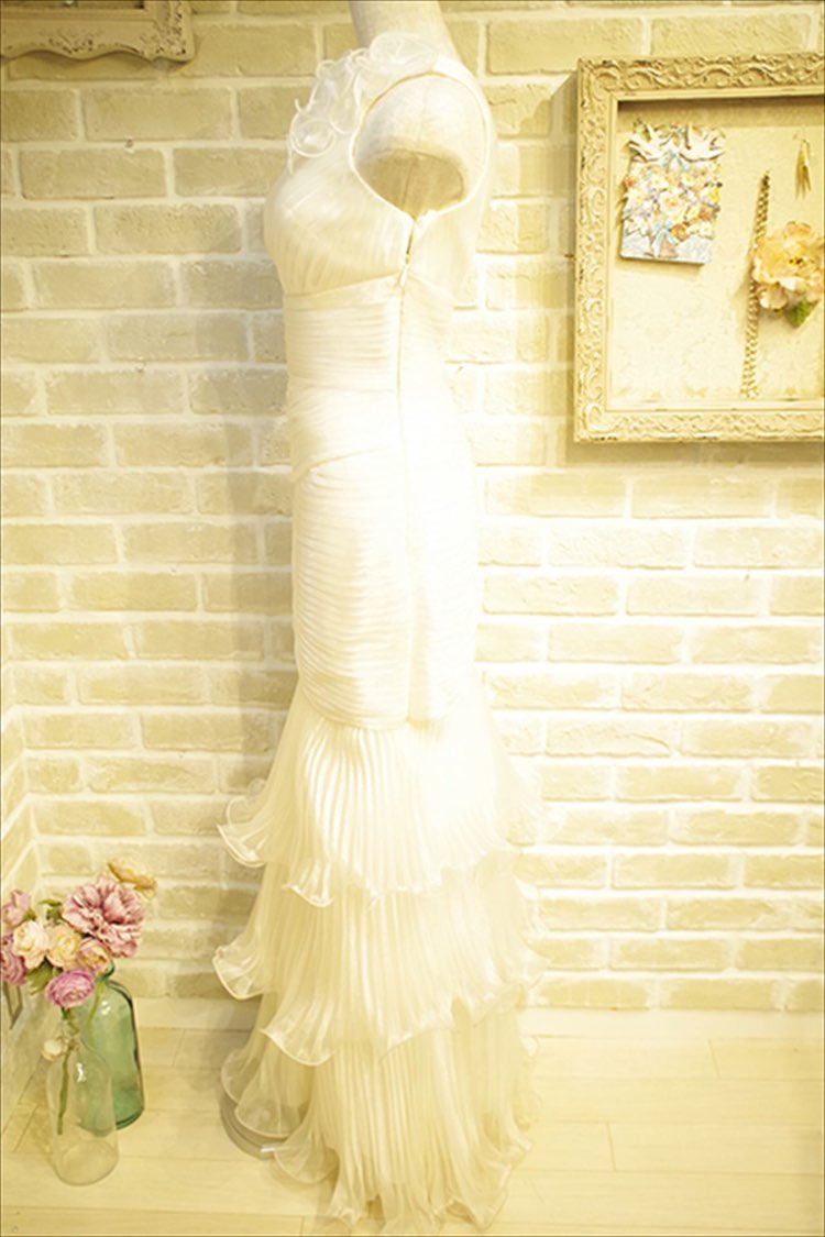 ワンショルダーで左肩にはお花コサージュがついているので顔まわりも華やかです。細かなプリーツ加工で縦長効果によりきやせして見えるマーメイドラインが美しいドレスです。花嫁さんの二次会、1,5次会だけでなく演奏会やお誕生日会、表彰式にもオススメな華やかでエレガントな一着です。
